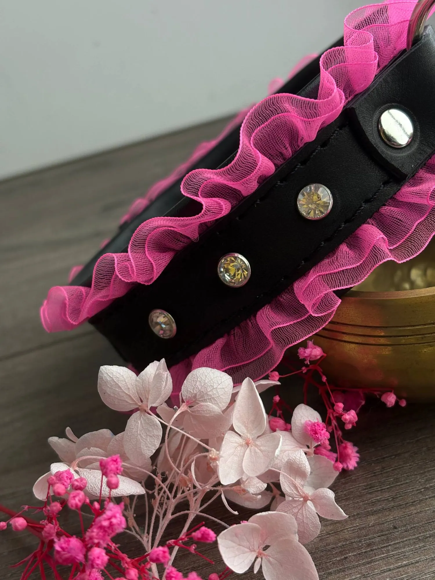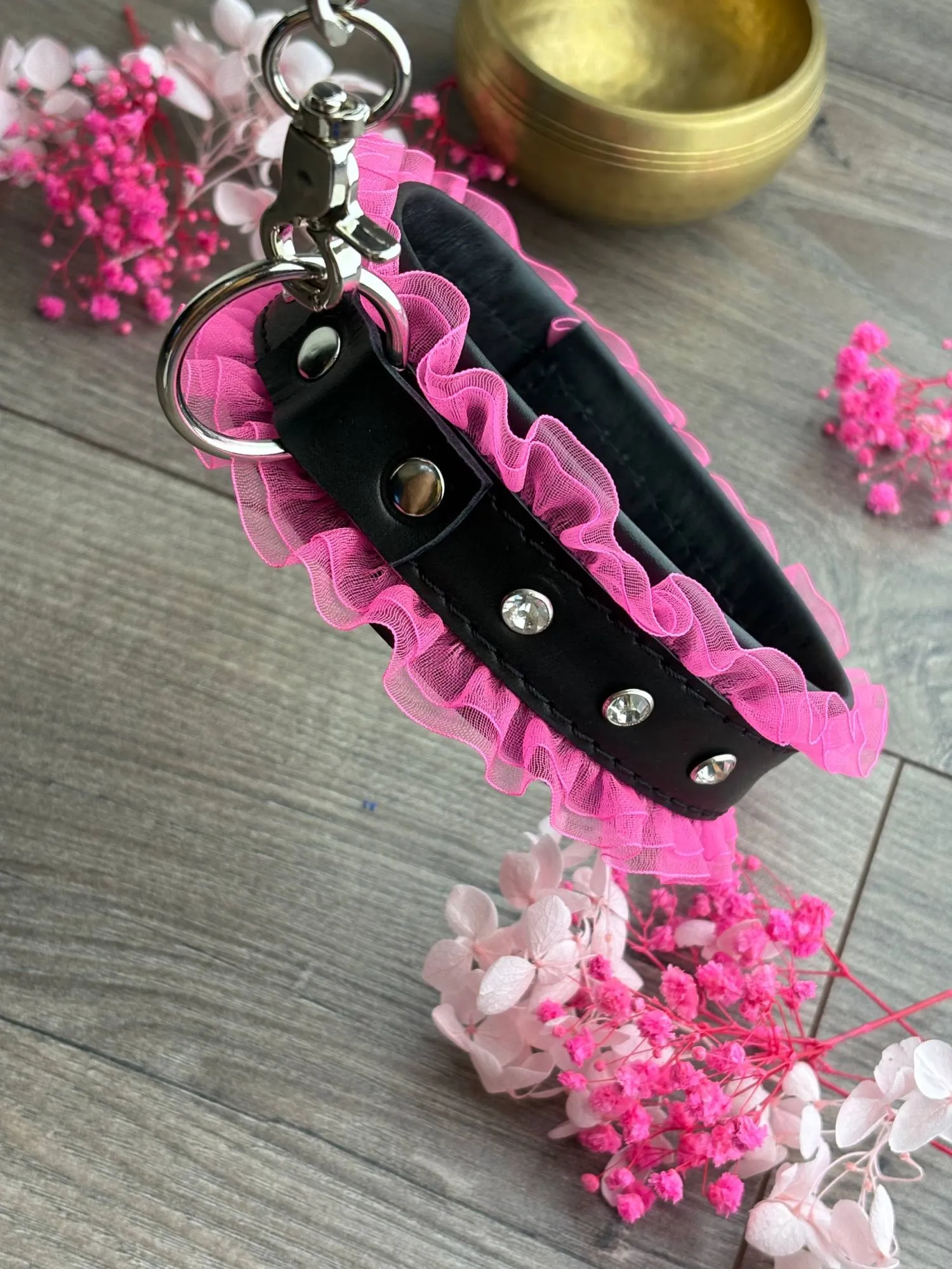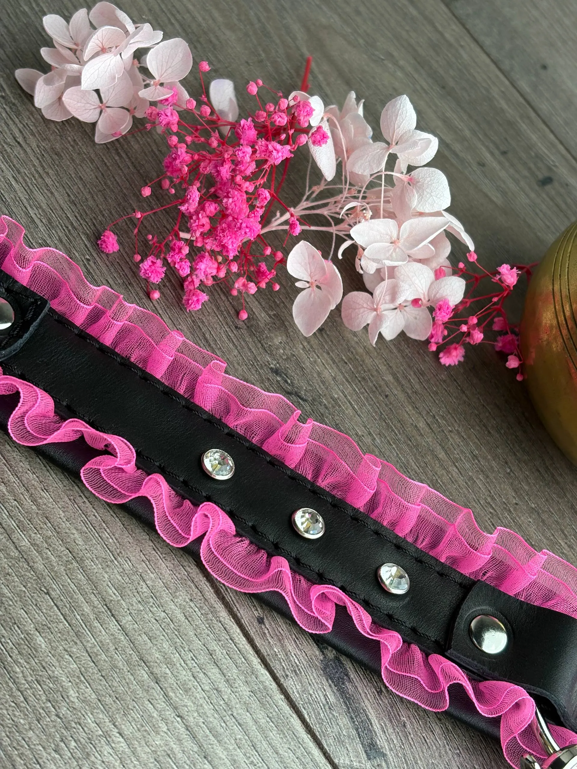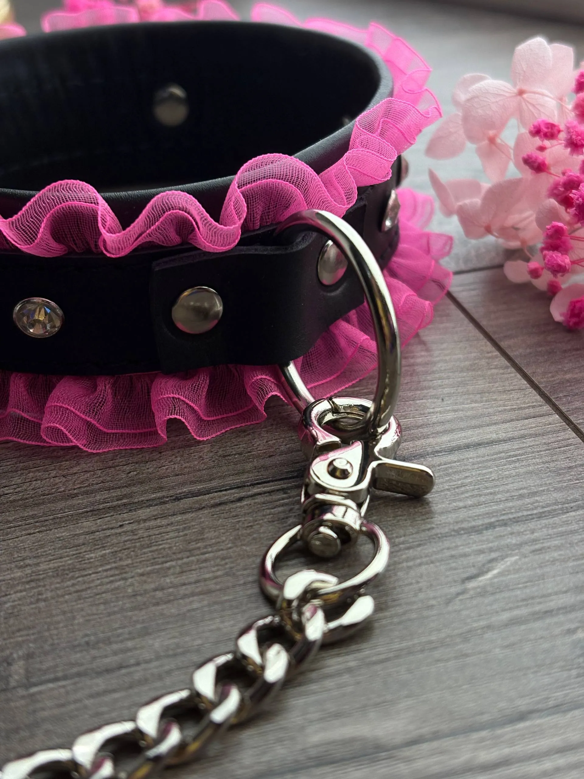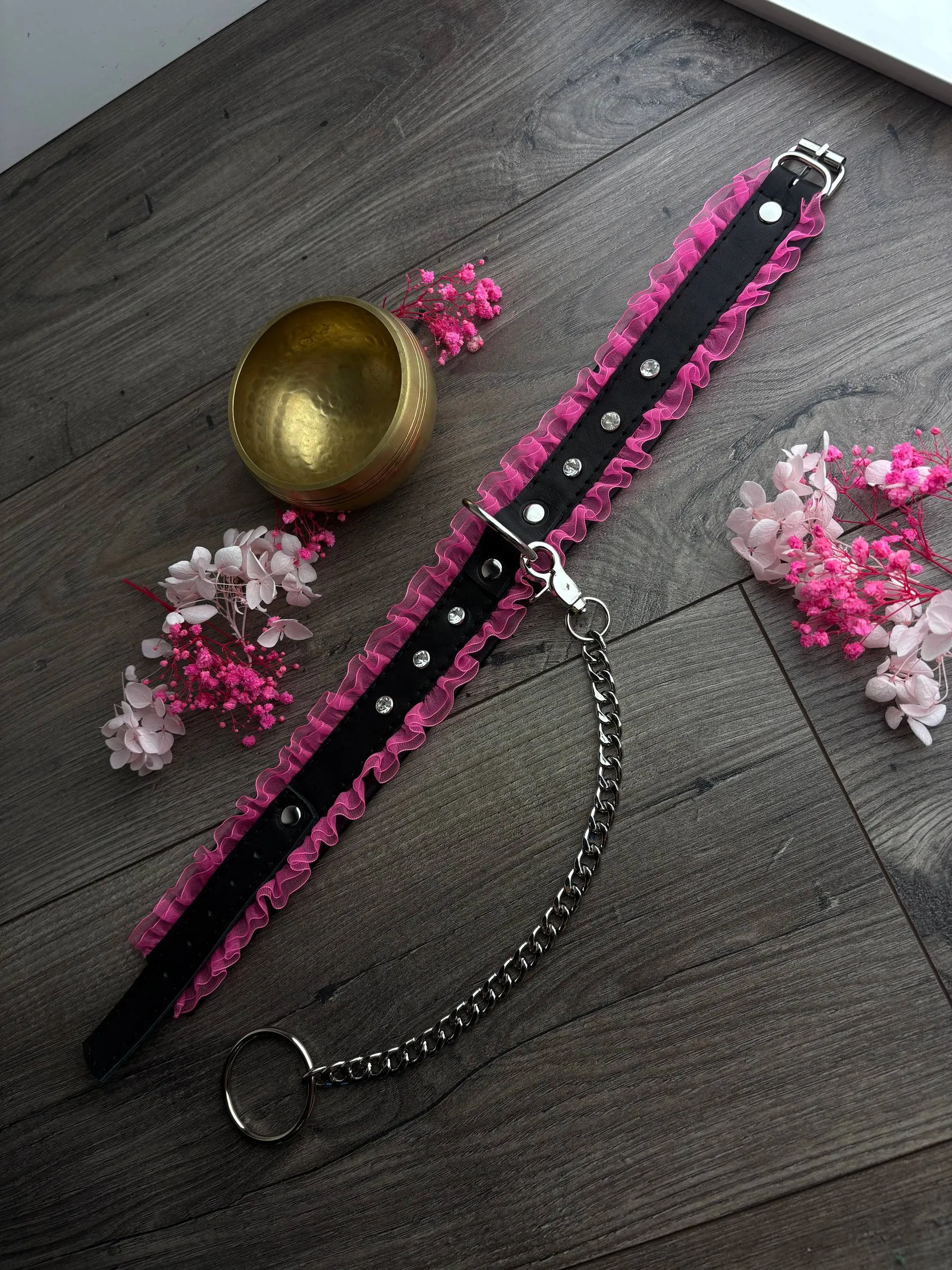Основа - натуральная кожа, декор - рюши и стразы, поводок-цепь в комплекте