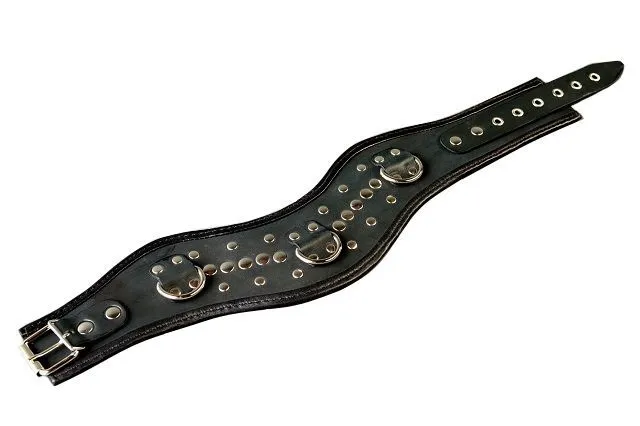 У этого черного фигурного ошейника от компании "Подиум" довольно необычная форма, благодаря чему выглядит он очень стильно и эффектно. Данная модель декорирована металлическими клепками и имеет несколько колец, за которые будет очень удобно цеплять, например, поводок. Ремешок с металлической пряжкой позволяет регулировать диаметр такого БДСМ аксессуара.