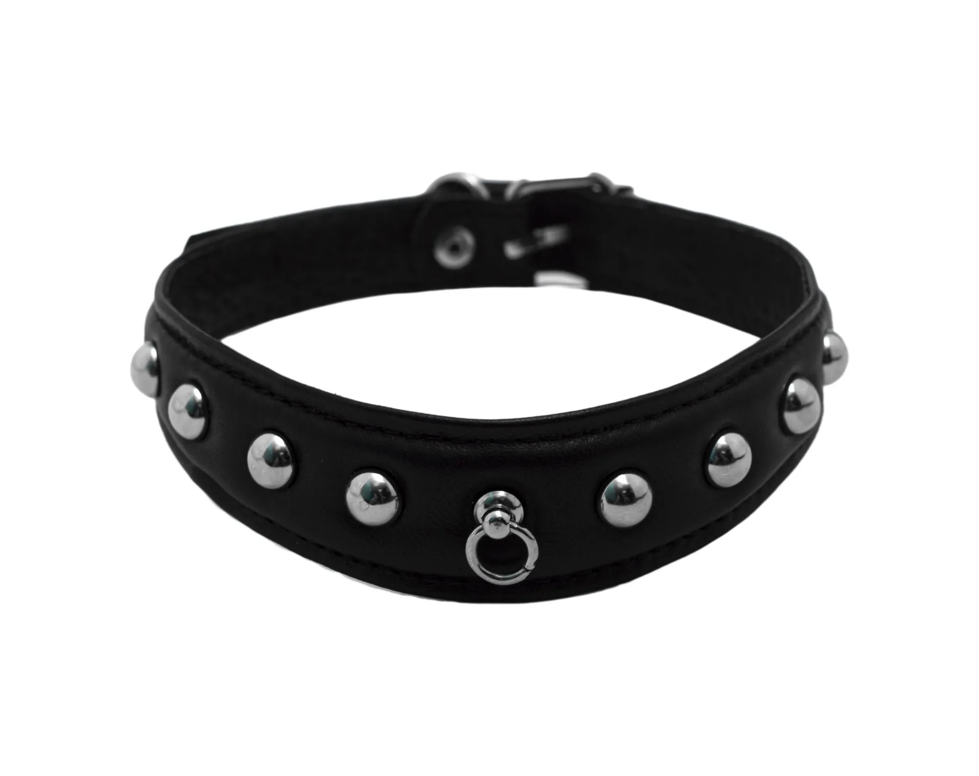 Поверхность этого фигурного узенького ошейника от компании "Подиум" декорирована блестящими металлическими клепками-шипами с тупыми концами. Также у ошейника предусмотрено специальное колечко, за которое можно цеплять поводок или другие бондажные аксессуары при помощи цепи с карабином. Этот аксессуар особенно актуален для поклонников жестких сексуальных игр и БДСМ. Такой ошейник будет великолепно смотреться с любым выбранным Вами эротическим костюмом и прекрасно акцентирует внимание на нежной шейке.