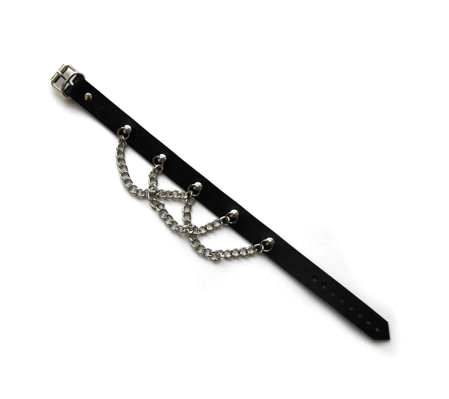 Чокер выполнен из натуральной кожи толщиной 2.3 мм и декорирован металлическими цепочками. Такой аксессуар можно носить с повседневной одеждой, чтобы придать своему образу дерзости и сексуальности. Также он будет отлично смотреться вместе с ролевым эротическим костюмом во время любовной игры с партнером. Чокер акцентирует внимание на прекрасной шейке и подчеркнет страстность Вашей натуры. Длина чокера регулируется при помощи ремешка с пряжкой, поэтому Вы сможете подогнать его под нужный размер.