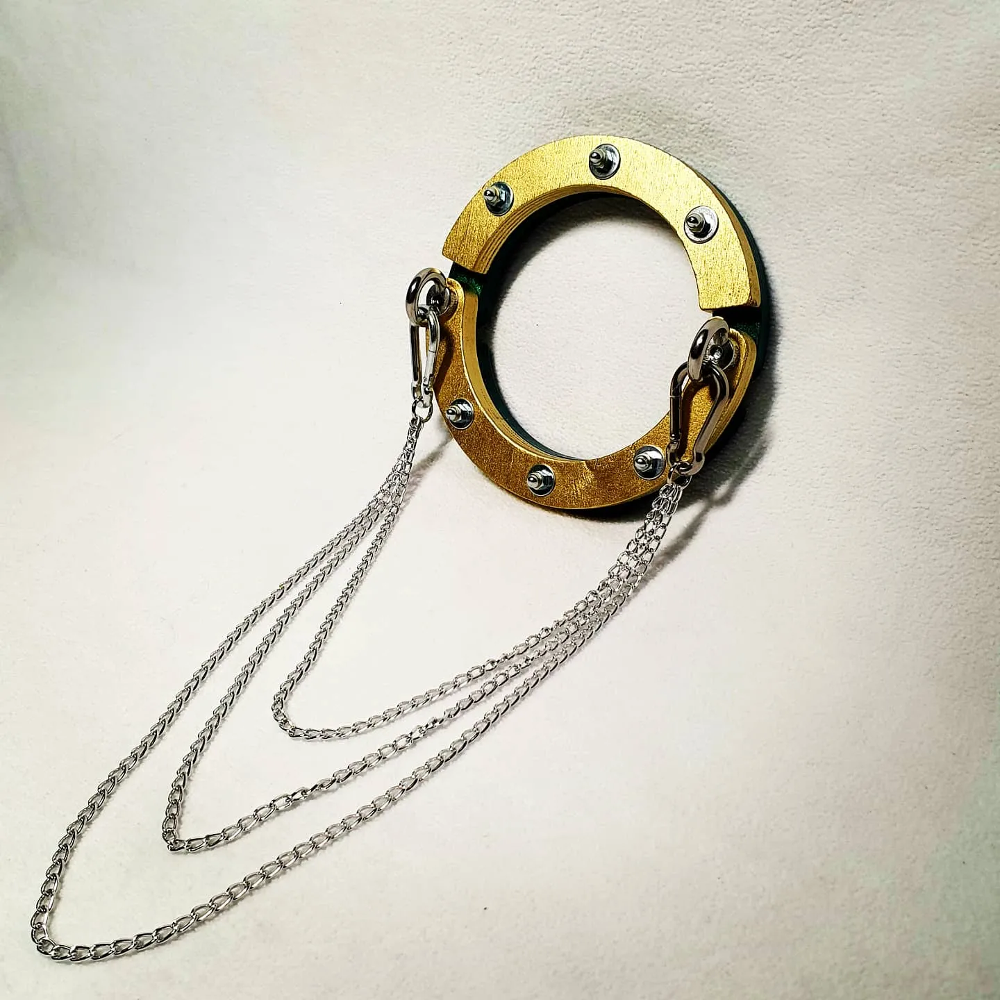 Твердотельный чокер утонченной формы, может быть использован как украшение или для БДСМ практик. С помощью него можно зафиксировать голову в одном положении, при этом не сдавливая шею. Для дополнения образа в наборе есть декоративные цепи, а также жесткие цепи с карабинами, которые позволяют соединять их с браслетами или напульсниками