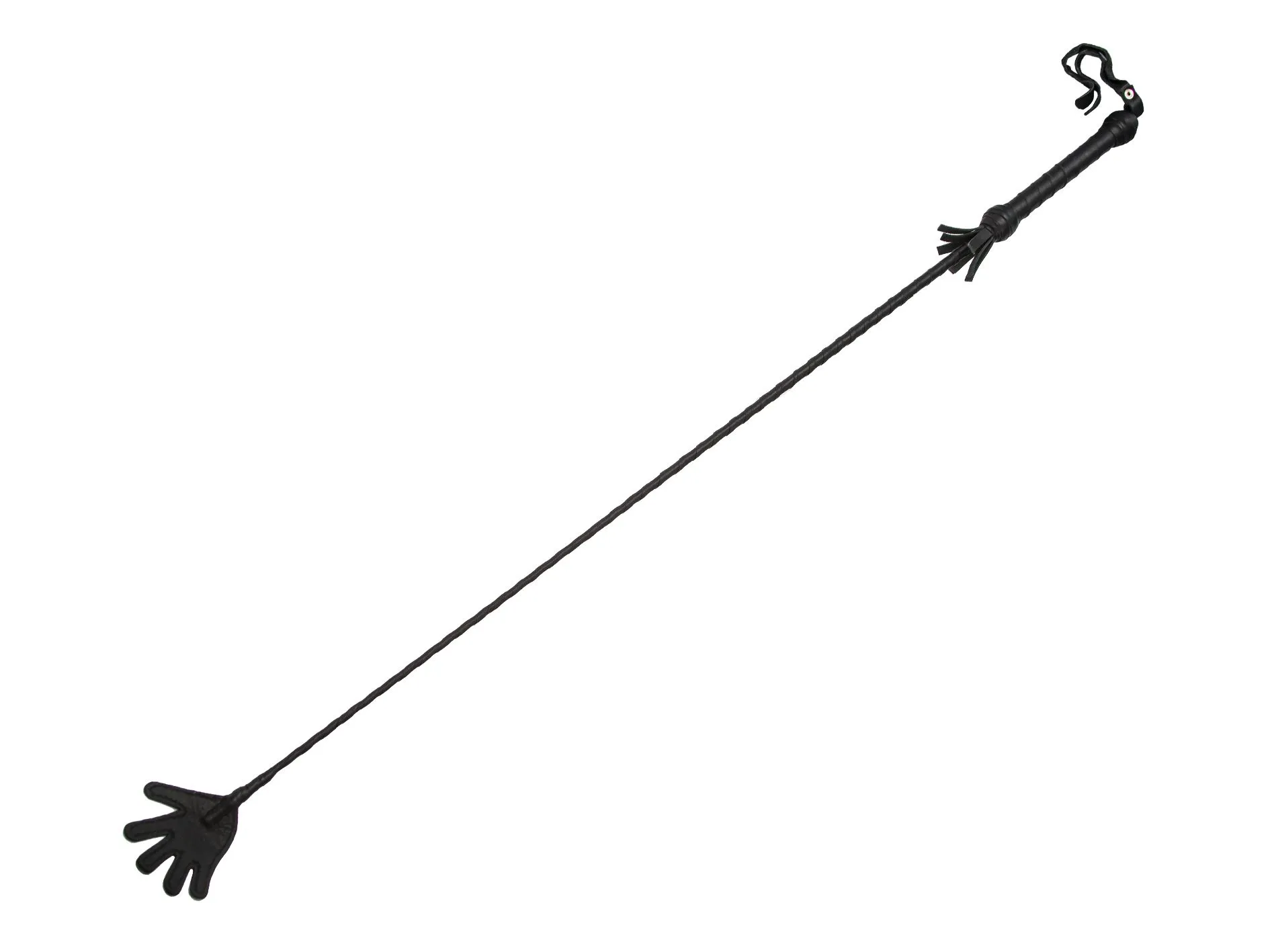 БДСМ стек длиной 850 мм состоит из гибкой основы, овитой натуральной кожей черного цвета, наконечника и удобной рукояти с петлей для надевания на руку (темляк). Стек по своему действию похож на БДСМ розги и ротанговыми тростями(прутьями). Удобство этого ударного в том, что его можно применять и как гибкий девайс. Работать наконечником нужно аккуратно, чтобы не травмировать тело обмоткой, посредством которой он крепится к основной части стека. Еще одно применение стека это частое использование его в качестве указки. Этот девайс часто применяется в психологических играх в доминирование в качестве указки – своеобразного «пульта управления».