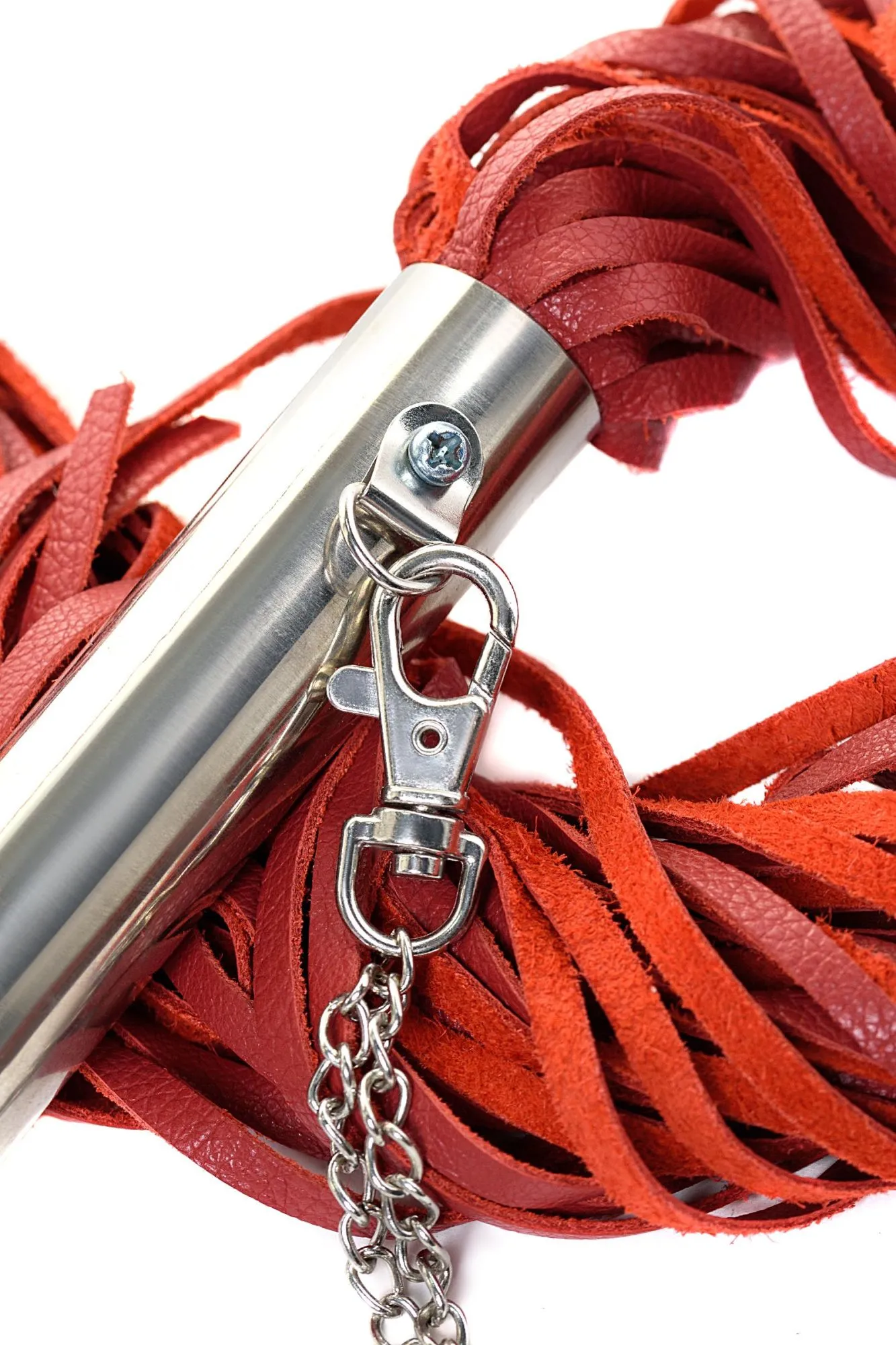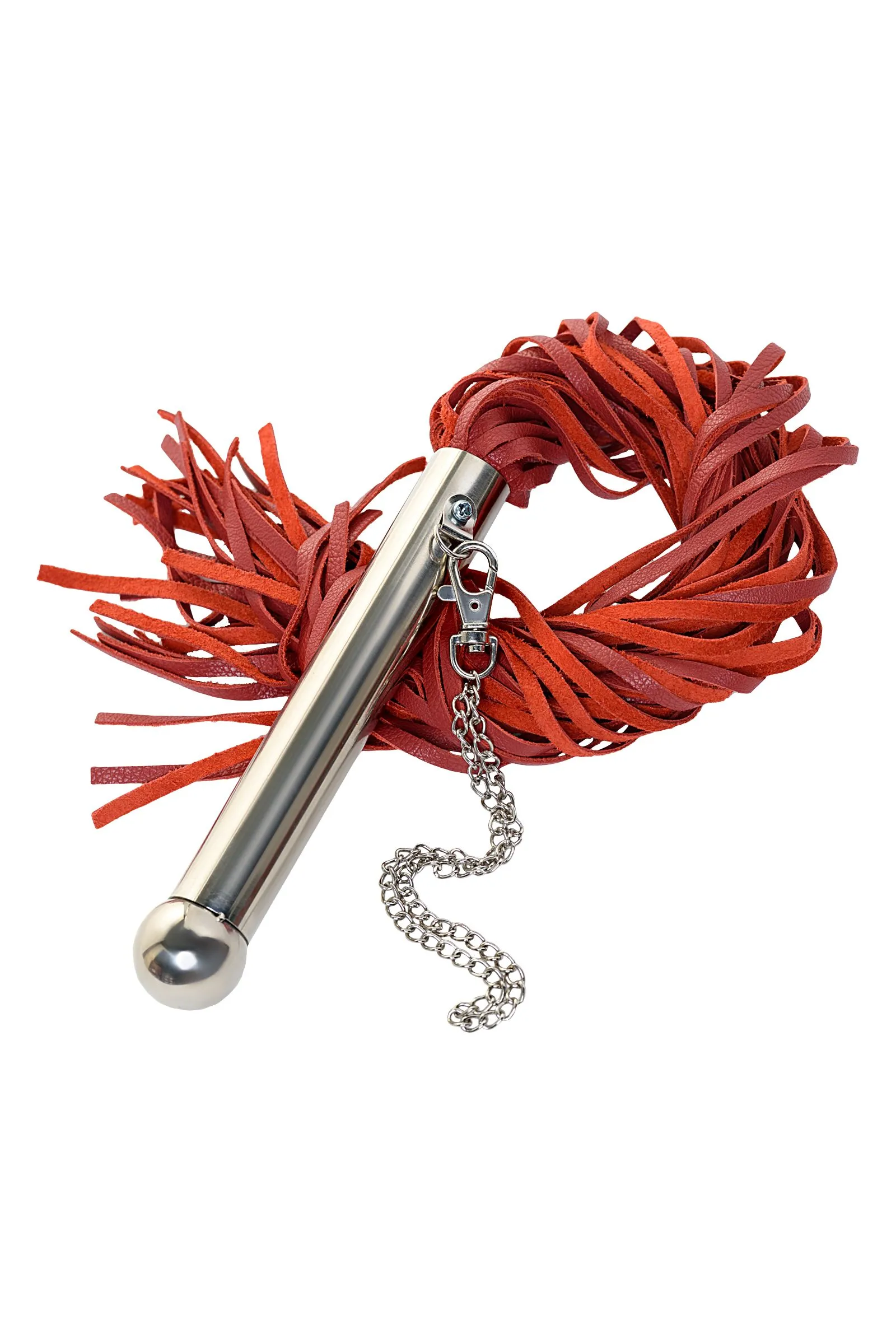Натуральная красная кожа и металлическая рукоятка — стильная классика жанра. Рукоятка 18 см с петлёй-цепочкой делает использование максимально удобным. И хоть предназначена плеть для средних и сильных воздействий по разогретому телу партнёра, лёгкие удары мягкой кожей также подарят непередаваемые ощущения.