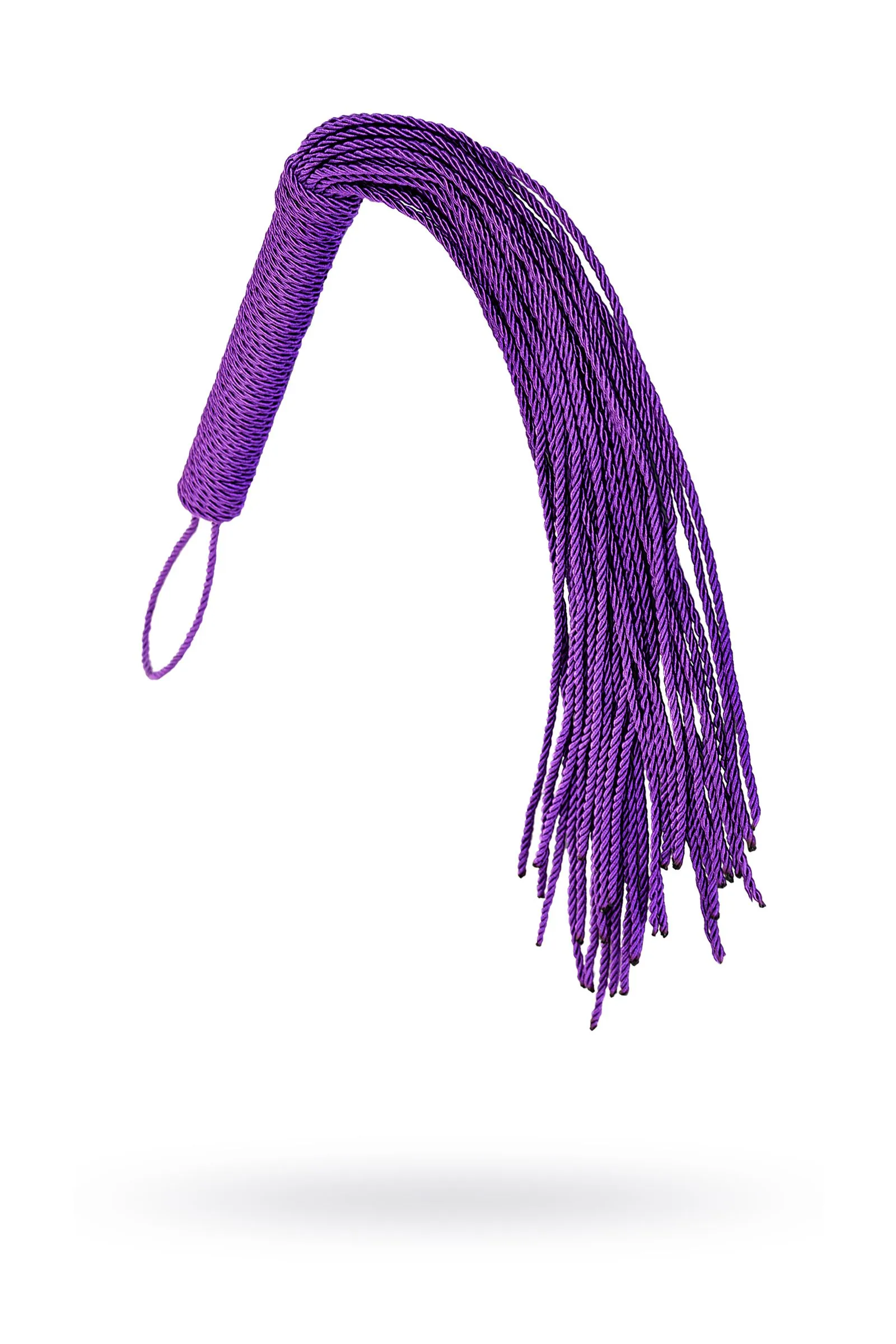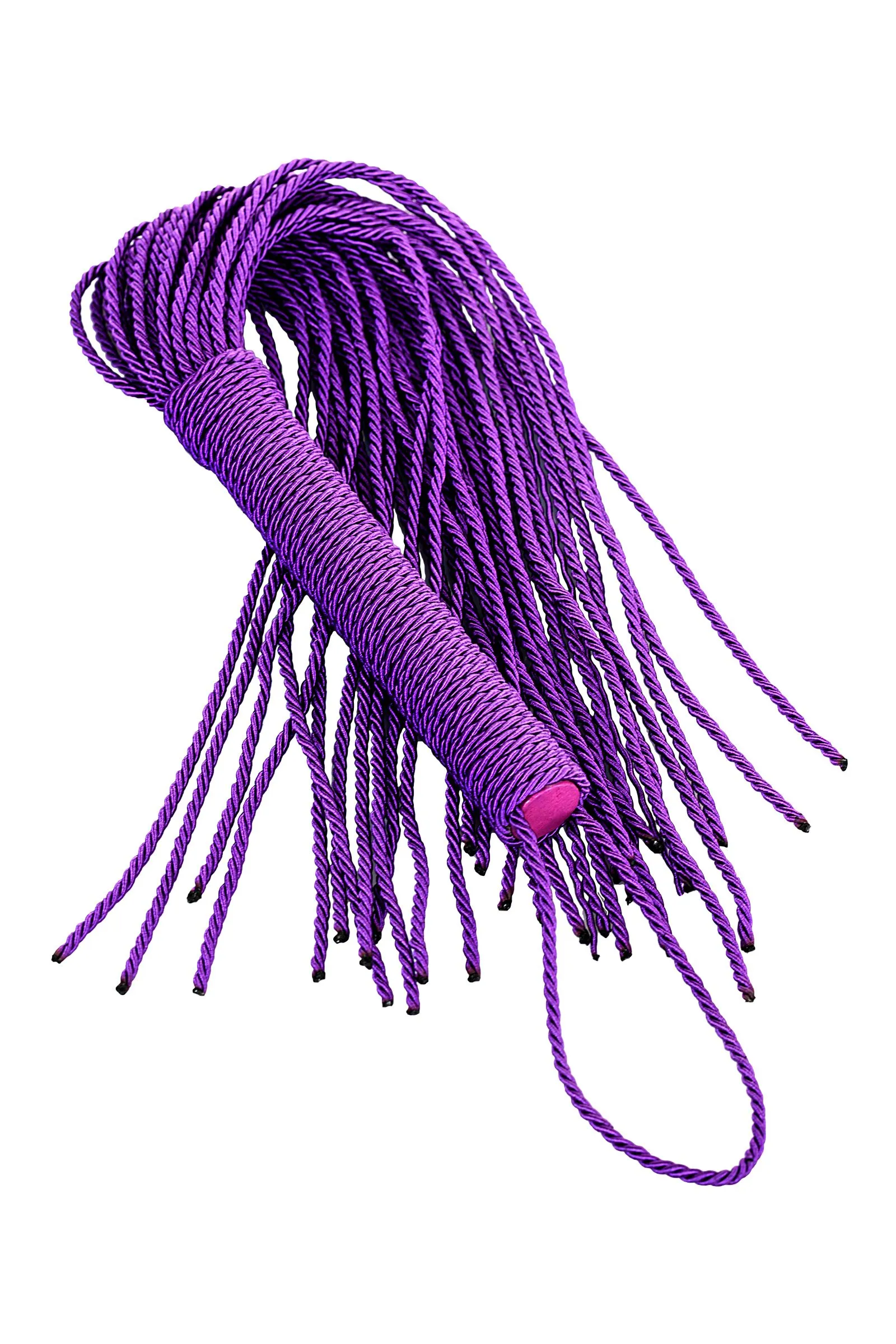 Сиреневый веревочный флоггер с плетеной ручкой мягко разогревает кожу и готовит к более серьезным воздействиям.