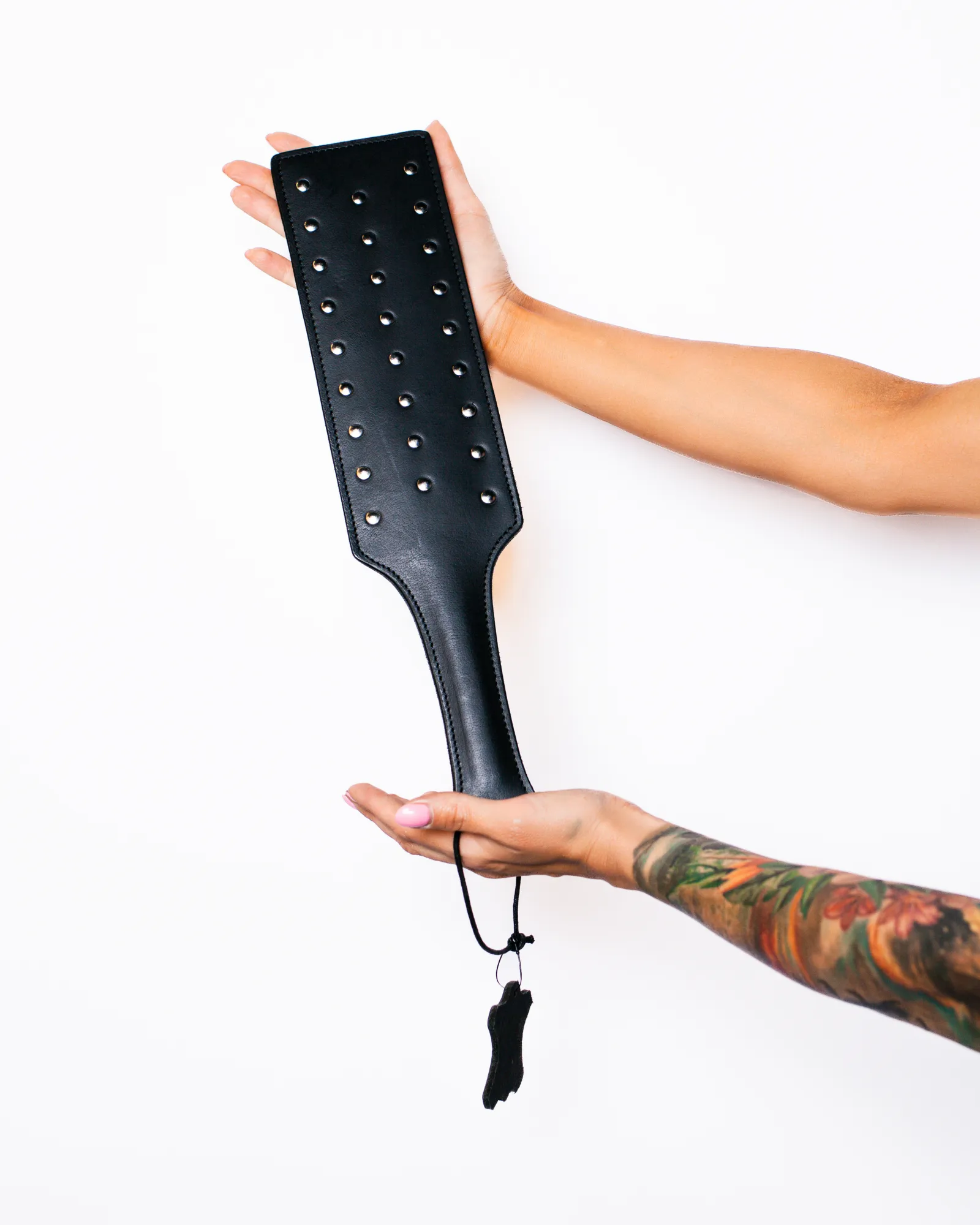 Изысканный широкий паддл из натуральной кожи, стилизованный клепками из нержавеющей стали. Паддл имеет удобную ручку, которая идеально ложится в руке.