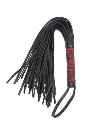 Плетка из чувственной премиум-коллекции эротических аксессуаров Scandal. Имеет красивую и удобную ручку покрытую тканью с дизайнерскими узорами из красных нитей. Длина: 69,25 см; Материал: PVC/Polyester; Производитель: California Exotic Novelties.