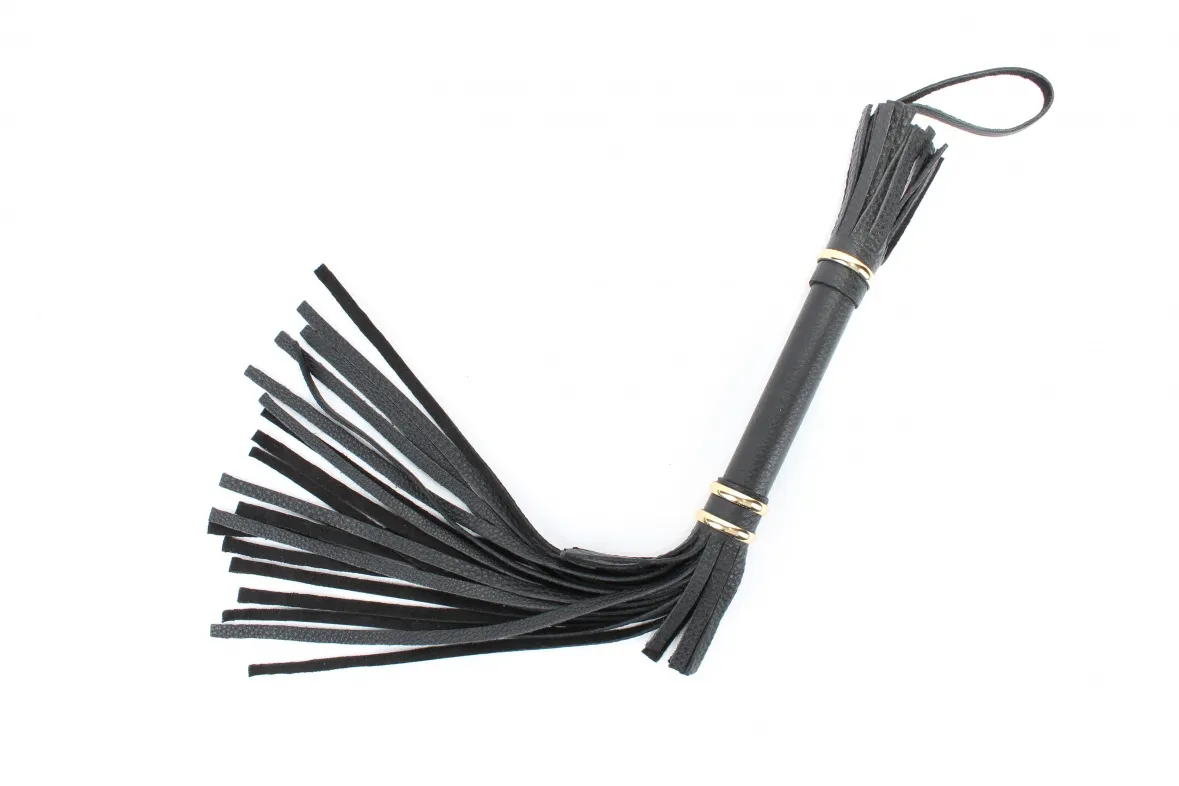 Аккуратная черная плетка, изготовленная из натуральной кожи. Имеет жесткую ручку длиной 17 см, так же покрытую кожей и украшенную золотыми кольцами. Имеется петля для удобного использования плети. Длина хлыстов - 27 см. Общая длина плети - 51 см.