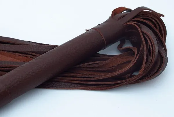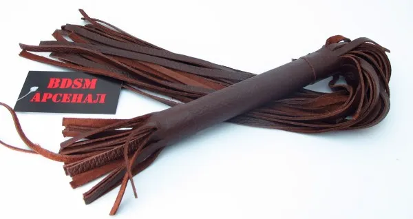 Аккуратная плетка коричневого цвета, изготовленная из натуральной кожи. Имеет жесткую ручку длиной 17 см, так же покрытую кожей. Имеется петля для удобного использования плети. Длина хлыстов -39 см. Общая длина плети - 56 см.