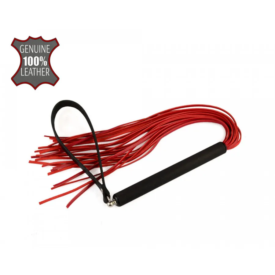 Небольшая плеть с хвостом из тонких 3-х мм лент натуральной кожи. Металлическая рукоять цилиндрической формы имеет диаметр 1,6 см, длину – 15 см. Общая длина изделия, без ремешка, 47 см. Цвет хвоста красный.