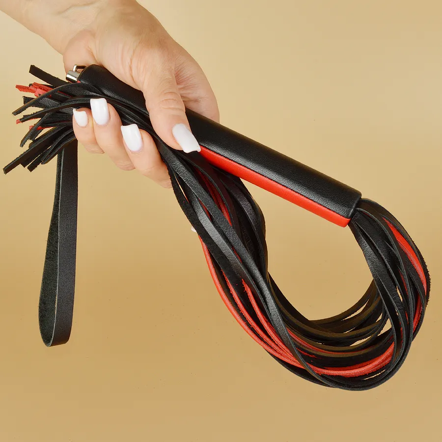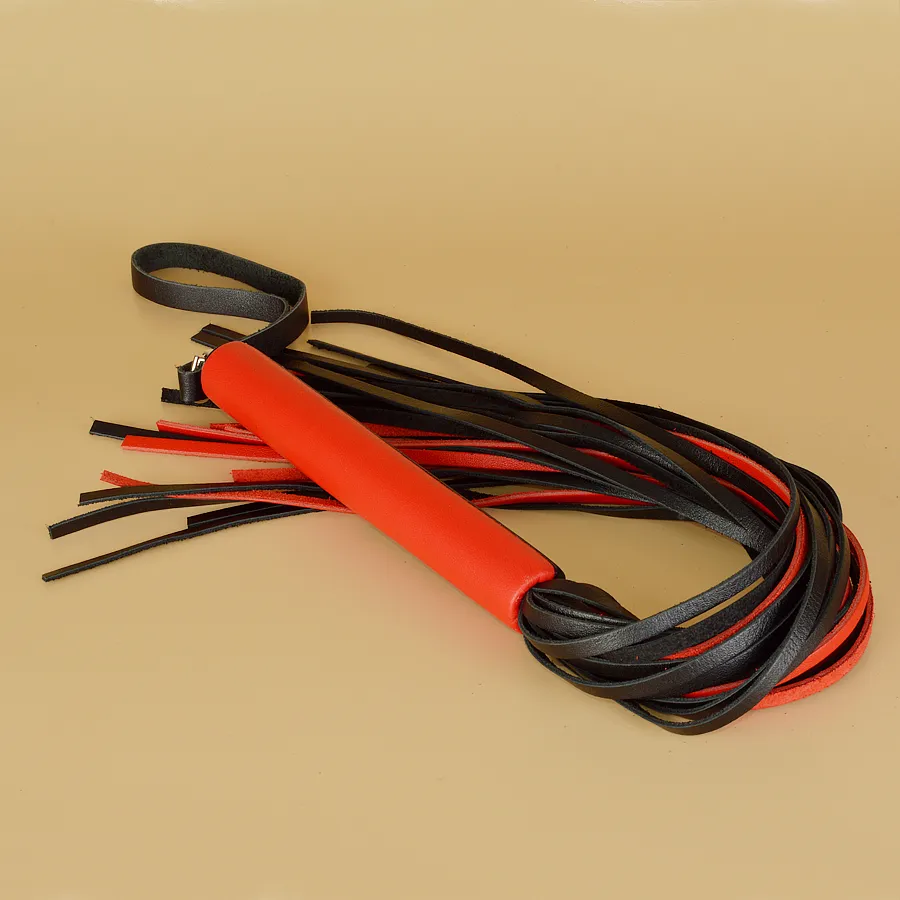 Плеть "Домино" полностью изготовлена из натуральной кожи красного и черного цвета. Для удобного использования на торце ручки имеется ремешок. Длина ручки – 17 см, длина ударной части 39 см. Масса нетто 150 гр.