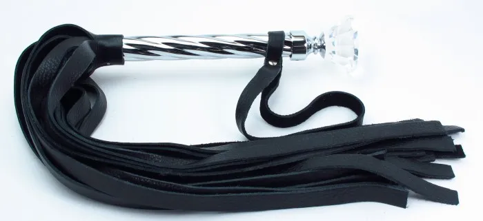 Великолепная плеть из кожи с жесткой рельефной рукоятью, украшенной кристаллом. Имеется ручка-петля для комфортного использования. Длина рукоятки - 20,5 см., длина хлыстов - 40 см.