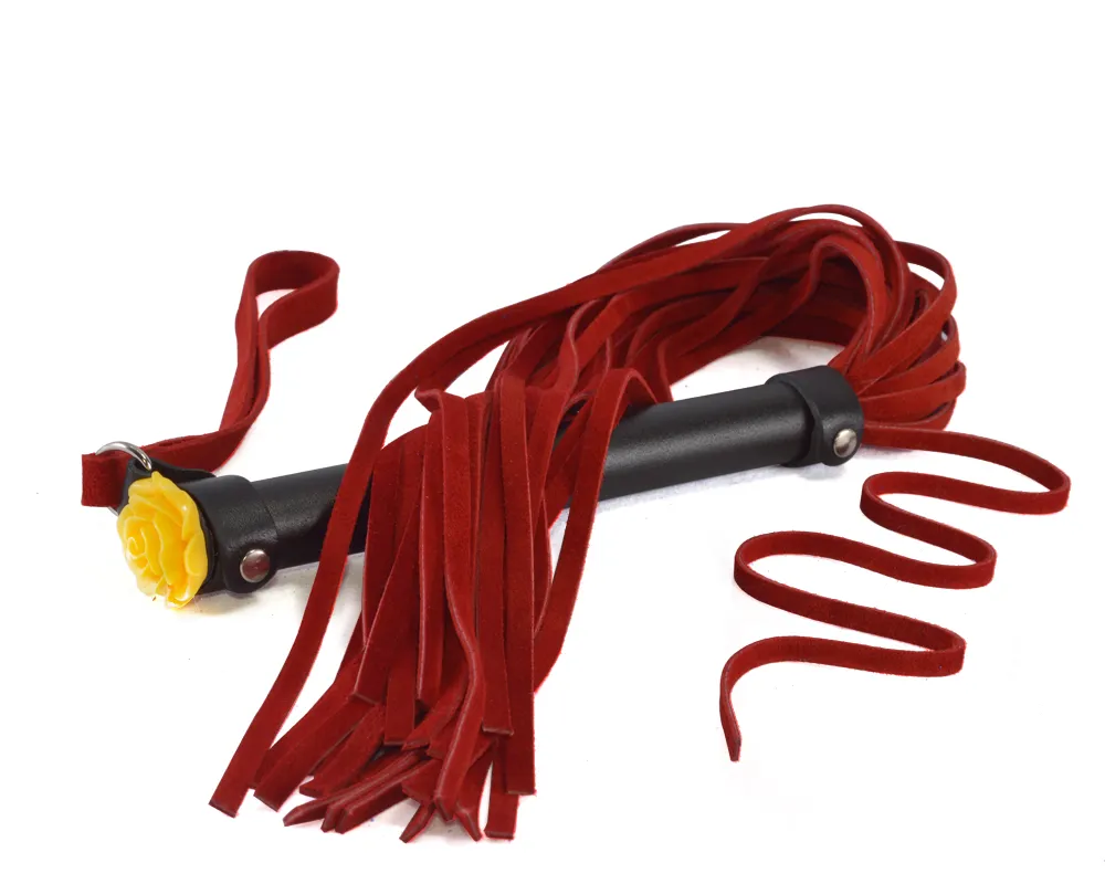 Плеть изготовлена из натуральной велюровой кожи. Цвет красный. Торец металлической рукояти украшен акриловой розой. Общая длина 57-60 см. Количество лент в хвосте 25-26. Длина рукояти 17 см, длина хвостовой части 39 см.