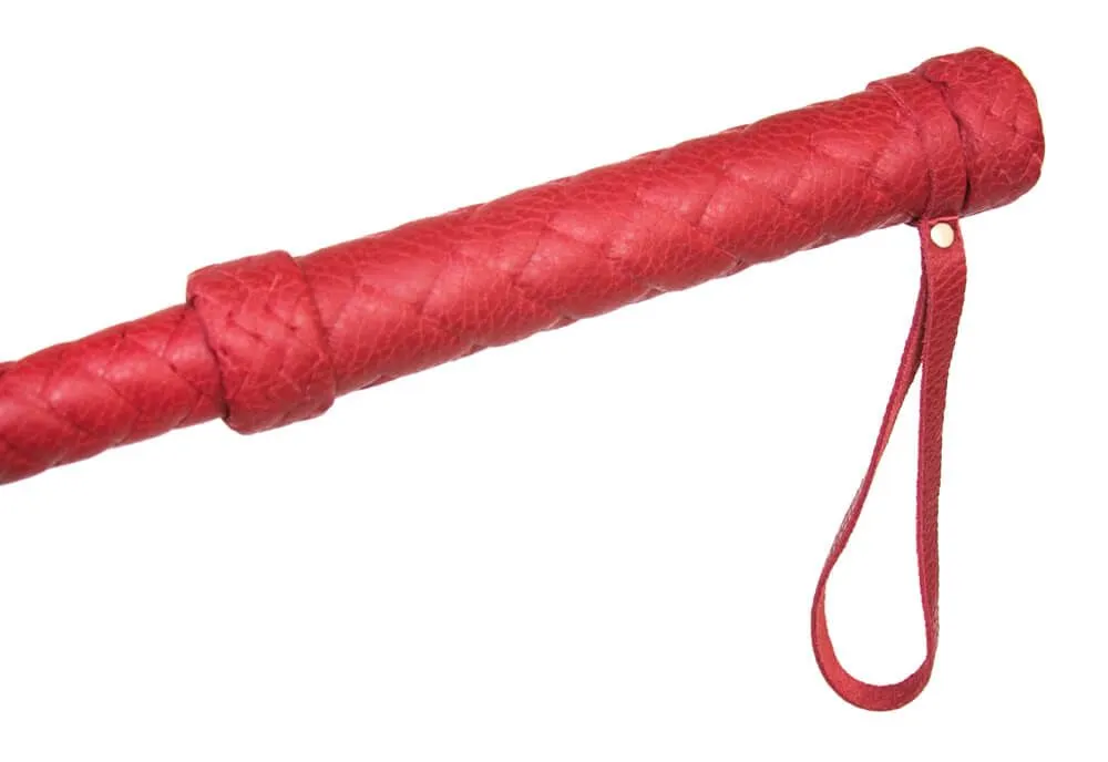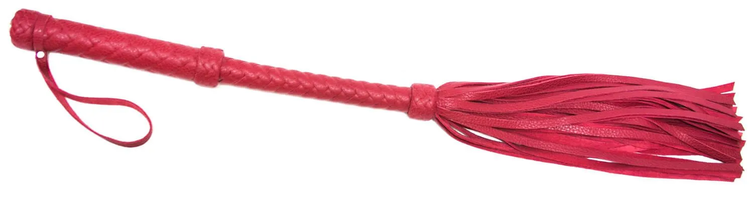 Флогер со множеством хвостов и плетеной рукояткой выполнен из натуральной кожи красного цвета. На конце рукоятки есть петелька для запястья.