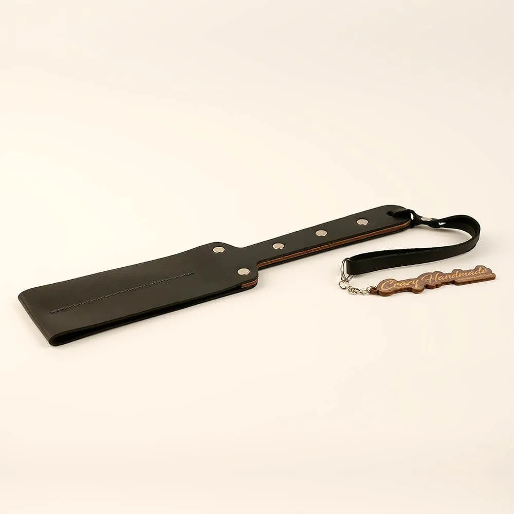 Эта шлепалка представляет собой мягкий паддл, выполненный из натуральной кожи черного цвета и дерева. С таким девайсом Ваши игры с элементами БДСМ станут еще более страстными и полными острых ощущений. Отшлепайте своего партнера, нанося ощутимые удары, чтобы показать ему его место и заставить повиноваться. Или же поощрите его нежными поглаживаниями за хорошее поведение. На ручке имеется кожаная петелька для запястья, благодаря которой паддл не выскользнет из Ваших рук. Внутри ручки есть деревянная вставка, поэтому она не будет сминаться.