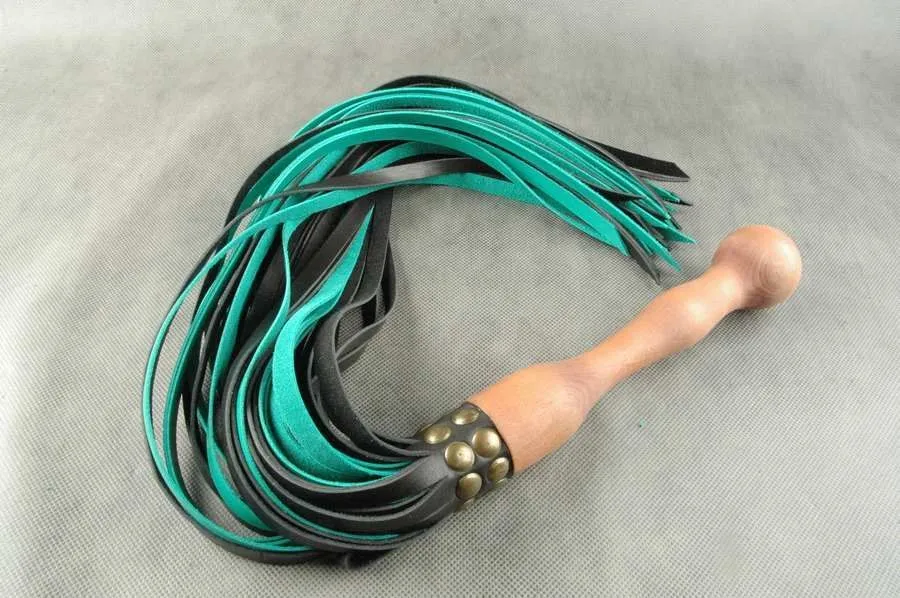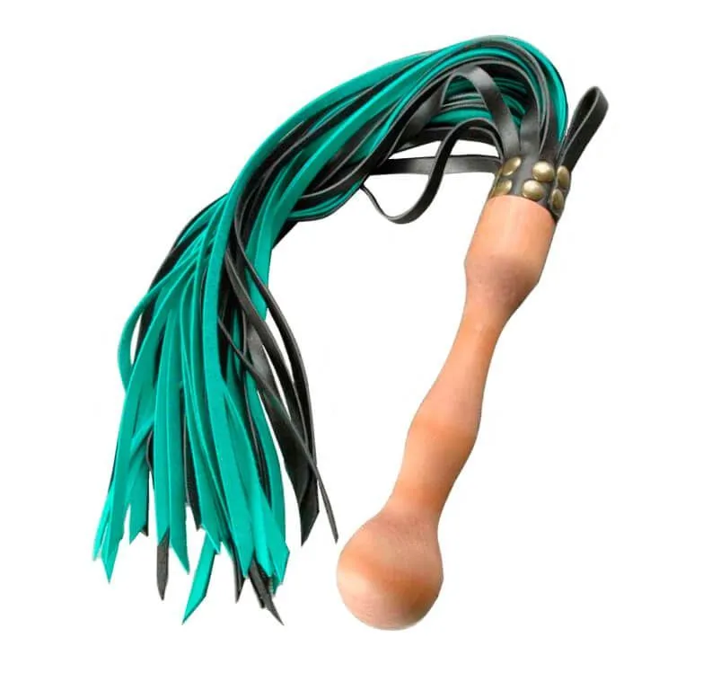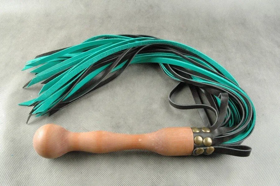Флогер длиной 750 мм, деревянная фигурная рукоять 220 мм тонированная под дуб или красное дерево, с петлёй для подвеса; с декоративными гвоздиками в основании хвостов: 40 полос 530 мм (Ш 10 мм): с внешней стороны 20 хвостов чёрного краста, внутри 20 хвостов лазурного краста – прямой рез на концах.