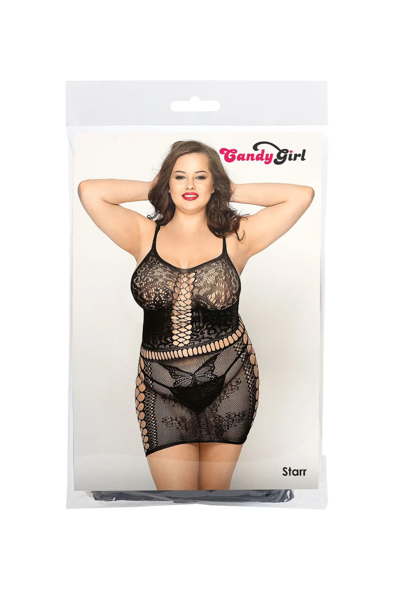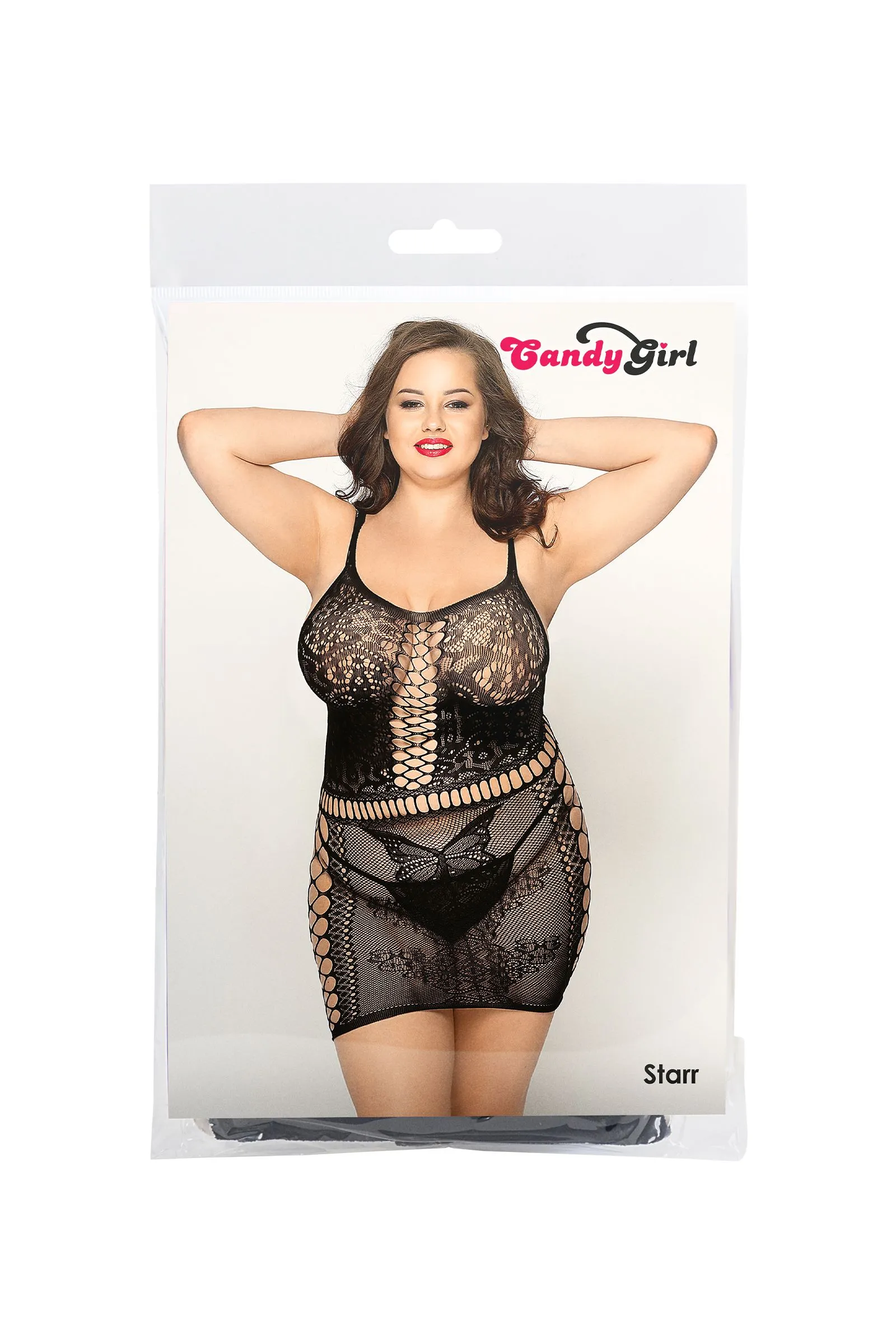 Эластичное бесшовное мини-платье из сетки Candy Girl® Starr украшено сочетанием различных плетений. Оно подчеркивает талию, зону декольте и бедра. Стринги в комплекте.