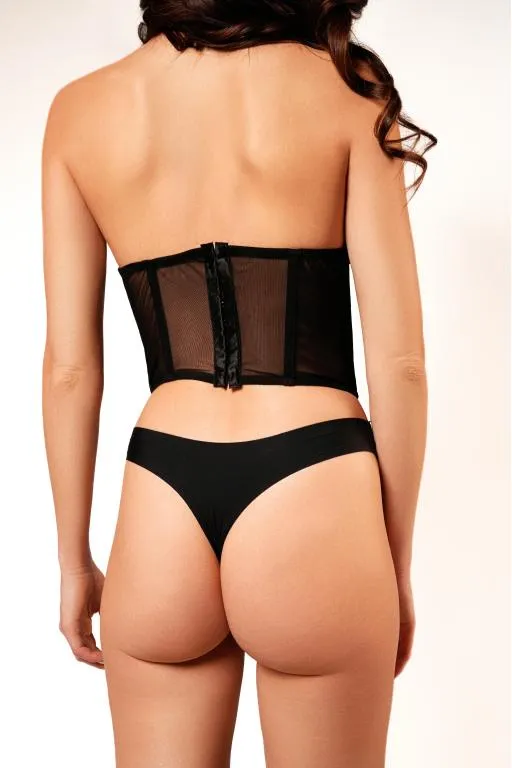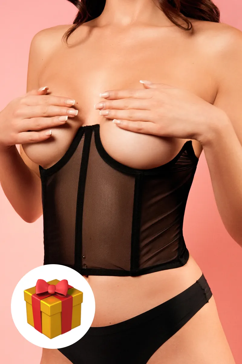 Корсет с косточками выполнен из полупрозрачной сеточки. Вставки вдоль корсета визуально делают силует стройнее. Открытая чашка у корсета дает возможность комбинировать его с повседневными топами и блузами, а также даёт возможность надеть пестисы и добавить еще больше сексуальности и игривости в кокетливый образ.