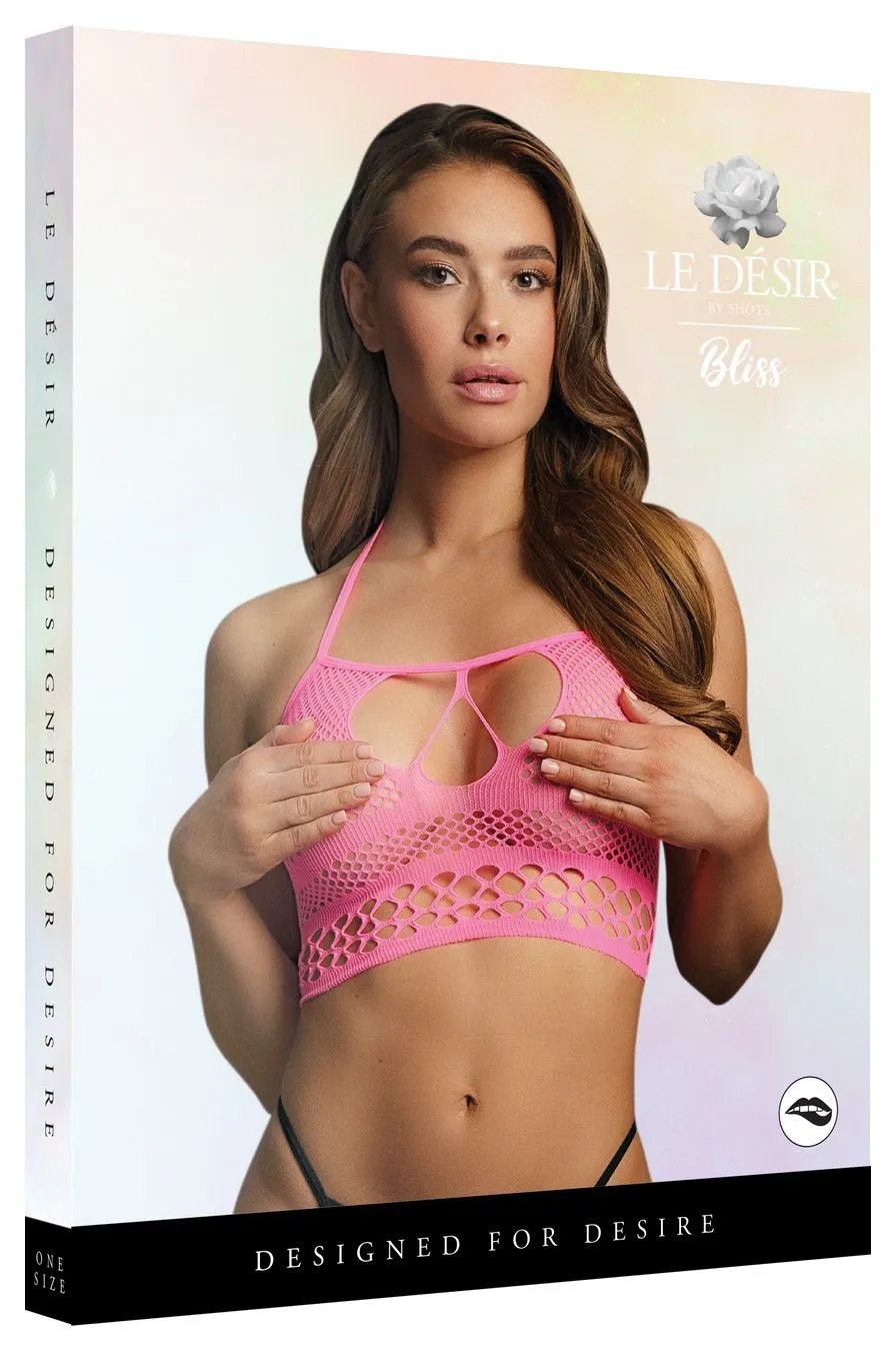 Укороченный топ с бретелькой через шею с полосатым вырезом из сетки. Имеет размер S-XL. Стринги не включены.