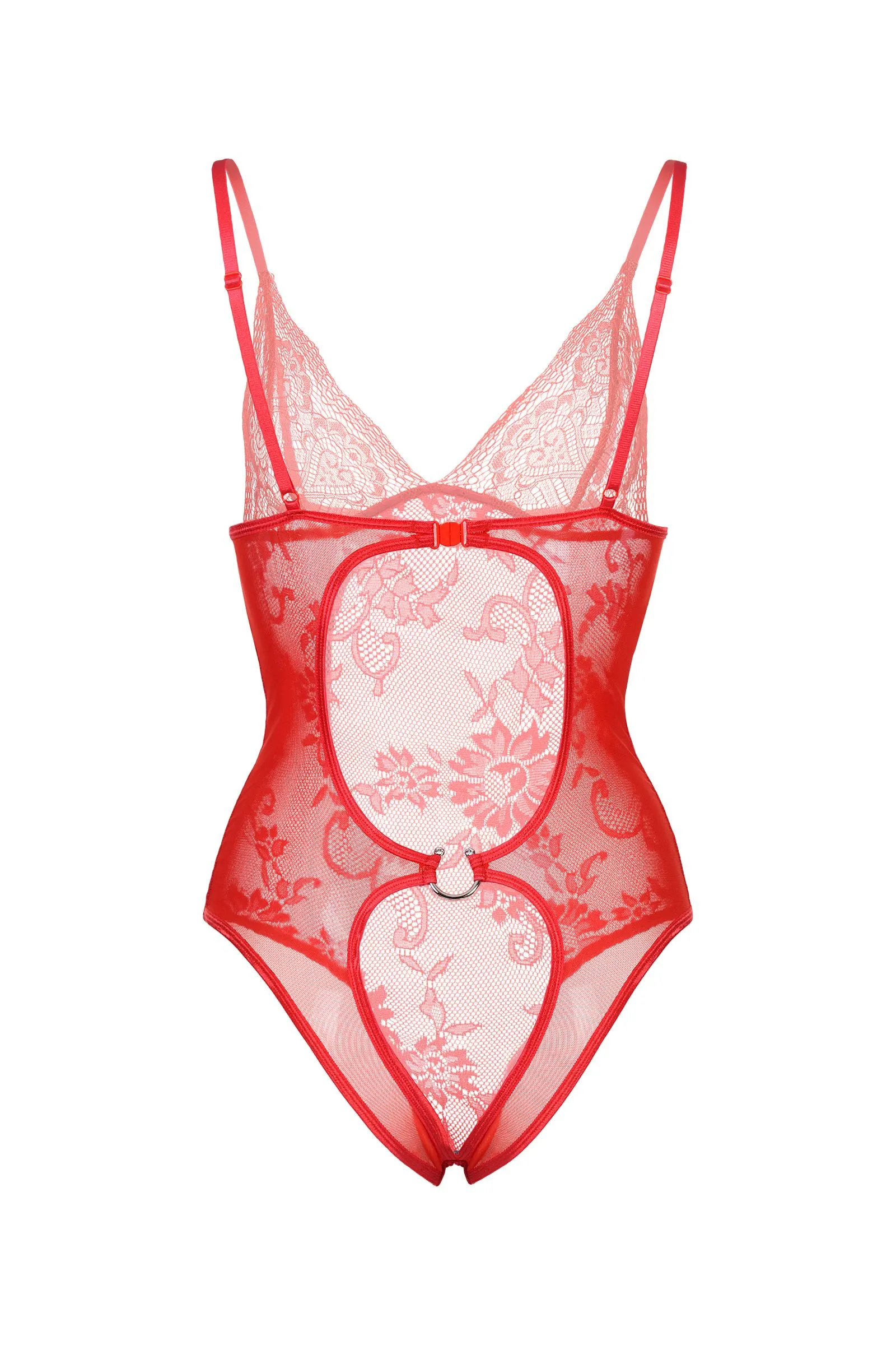 Эластичное боди из мягких материалов: кружева и сетки. Открытый доступ сзади и эффектный акцент в виде металлического полукольца притягивают все внимание к себе. Регулируемые бретели и застежка на уровне груди сзади обеспечивают идеальную посадку.