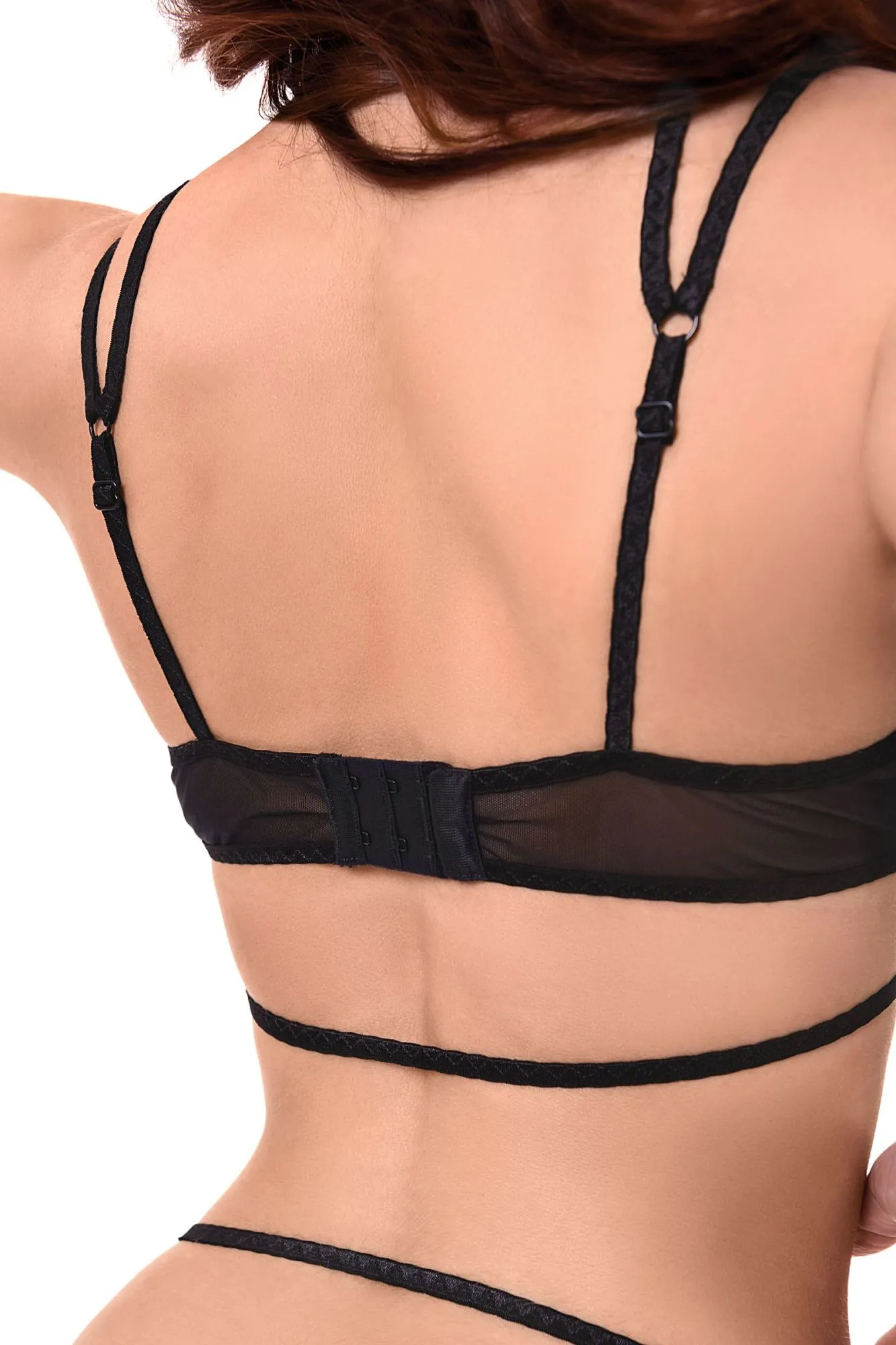 Эротическое боди с кружевным жабо Erolanta® Eva из эластичной сетки со вставками кружева со свободным краем. Фигурные вырезы открывают верхнюю часть груди. Регулируемые бретели и застежка на спине. *Допускается замена кружева на аналогичное.