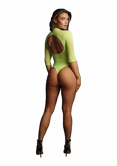 Боди в сеточку с круглым воротом и контрастным V-образным вырезом. У боди короткие рукава и круглый вырез на спине. Это боди имеет размер S-XL. Стринги не включены.