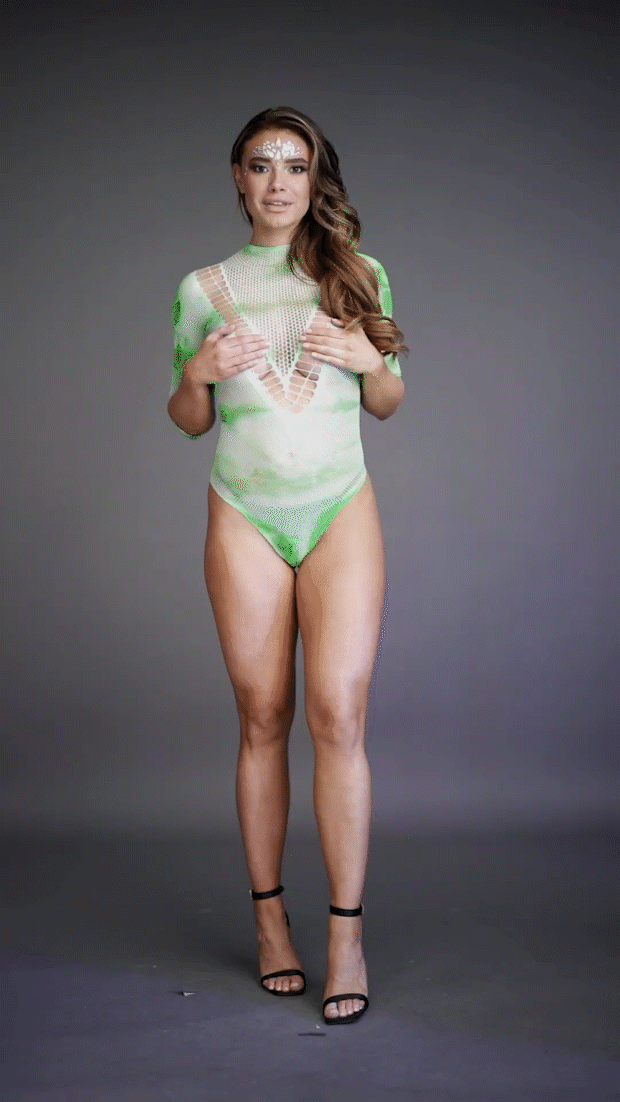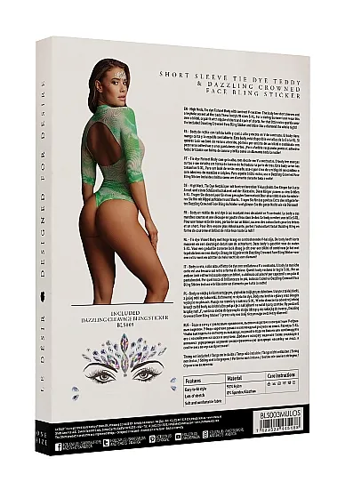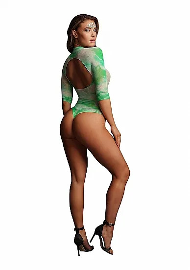 Боди в сеточку с круглым воротом и контрастным V-образным вырезом. У боди короткие рукава и круглый вырез на спине. Это боди имеет размер S-XL. Стринги не включены.