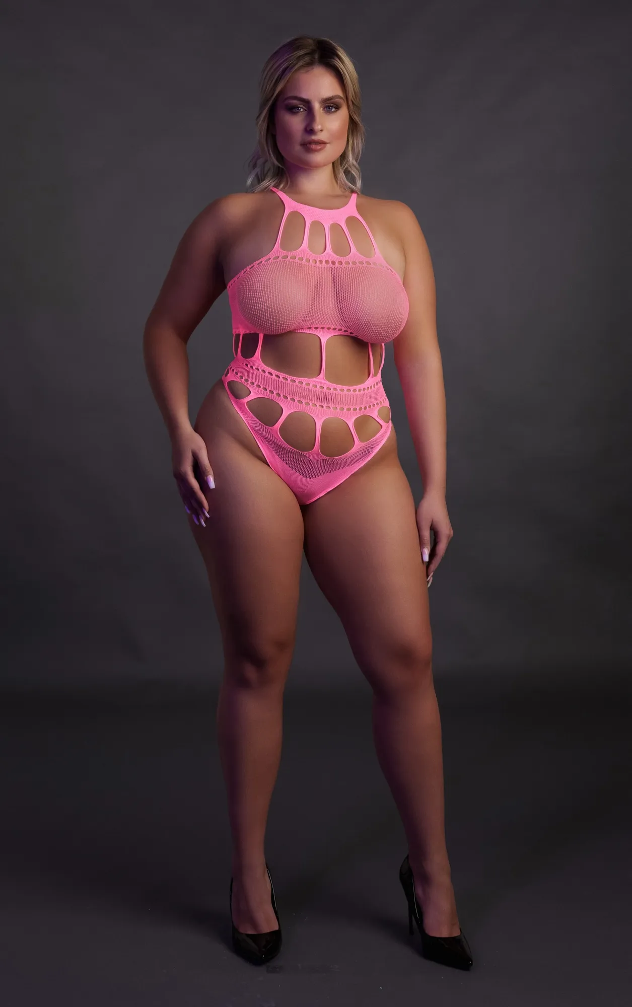 Шикарный неоновый комплект из трусиков и топа с высоким воротом. Изделия изготовлены из плотной сетки и декорированы красивым сексуальным узором притягивающим взгляд. Такое белье скрывает недостатки, подчеркивает достоинства фигуры и будет шикарно смотреться как с публичным нарядом, так и в спальне.
