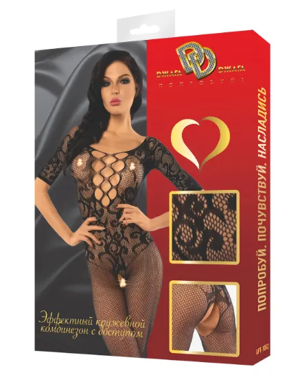 Эффектный кетсьюит полностью закрывает ноги, подчеркивая их стройность и зрительно увеличивая длину. При этом зона промежности остается открытой, костюм не придется снимать при завершении прелюдии. Его можно надевать без нижнего белья или комбинировать с бюстгальтером, он отлично подойдет для смелых экспериментов в постели. Эластичный материал легко растягивается, зона декольте дополнена глубоким вырезом и переплетением тонких веревочек , что делает образ еще более соблазнительным! Выполнен из мелкой сеточки с ажурным орнаментом по полочке, спинке и рукавам.