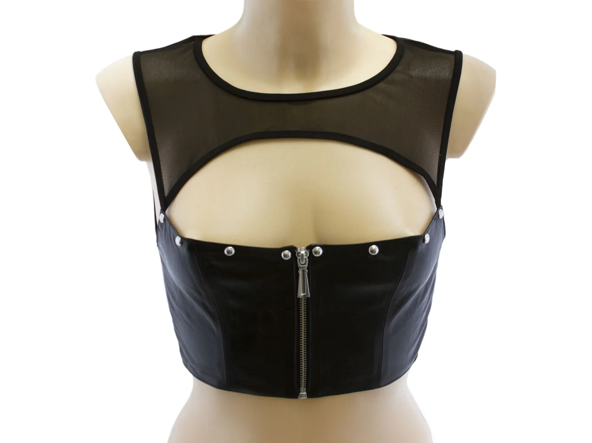 Сексуальный топ от бренда Lapin Rose сделан из натуральной кожи черного цвета и прозрачной микросетки. Топ украшен декоративными деталями из металла. Округлый вырез в зоне декольте сразу привлечет к Вам внимание и акцентирует внимание на форме груди. Топ застегивается на молнию, при помощи которой Вы сможете контролировать длину выреза.