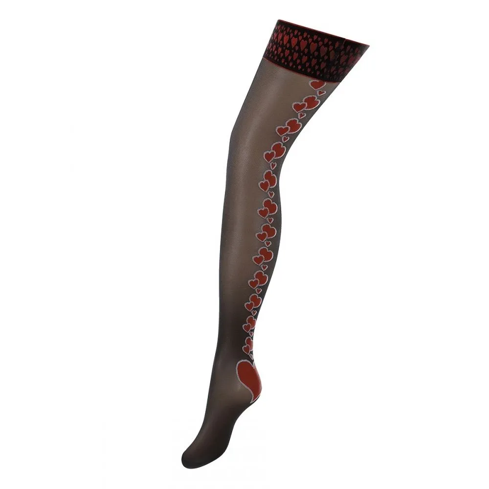 Женские чулки от компании Charmante Annamensis подойдут девушкам с размером S/M. Самоклеящиеся чулки хорошо держатся на ноге. Черные чулочки сзади и на резинке украшены рисунком из красных сердец разного размера. Такой дизайн делает ножки визуально длиннее и приковывает к ним множество восхищенных взглядов.