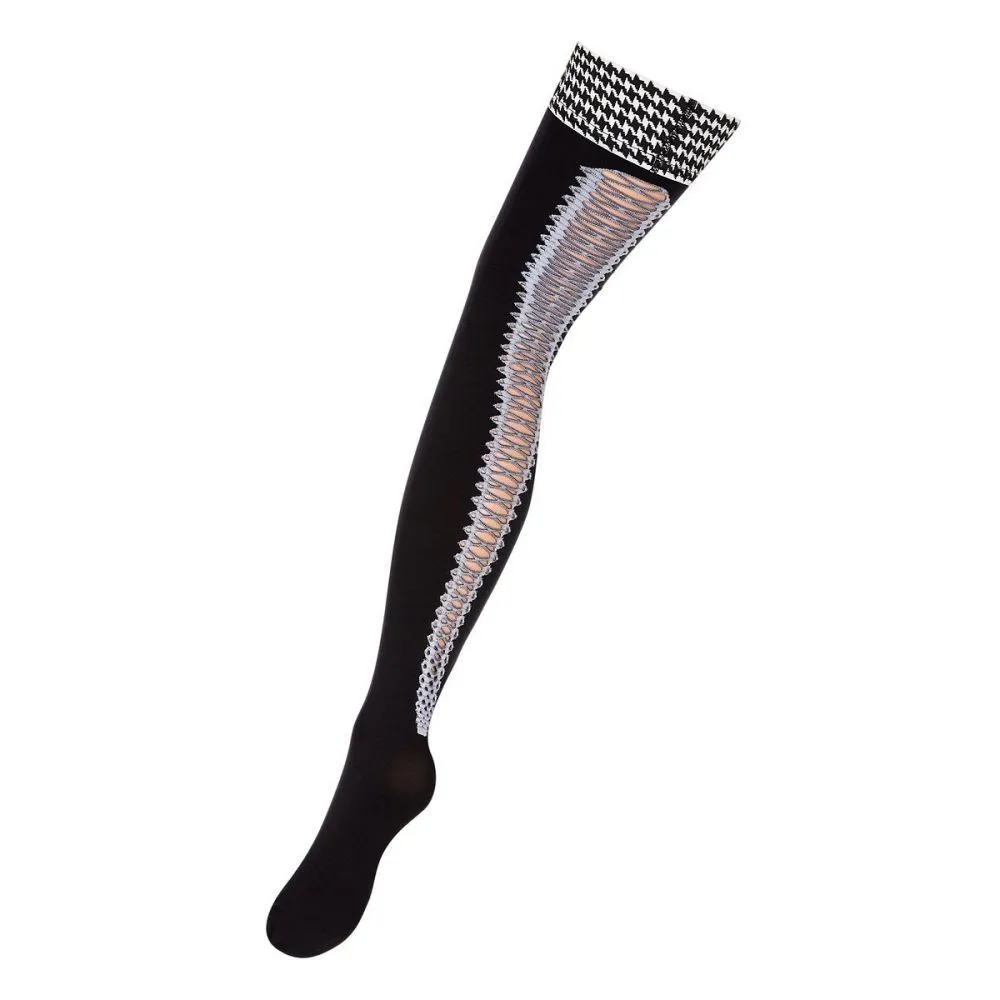Изумительные чулки с эффектной шнуровкой по задней детали, подчёркивающей стройность и длину ног, а также чувство вкуса их обладательницы. Резинка с графическим принтом имеет силиконовую основу, позволяющую носить чулки без пояса.
