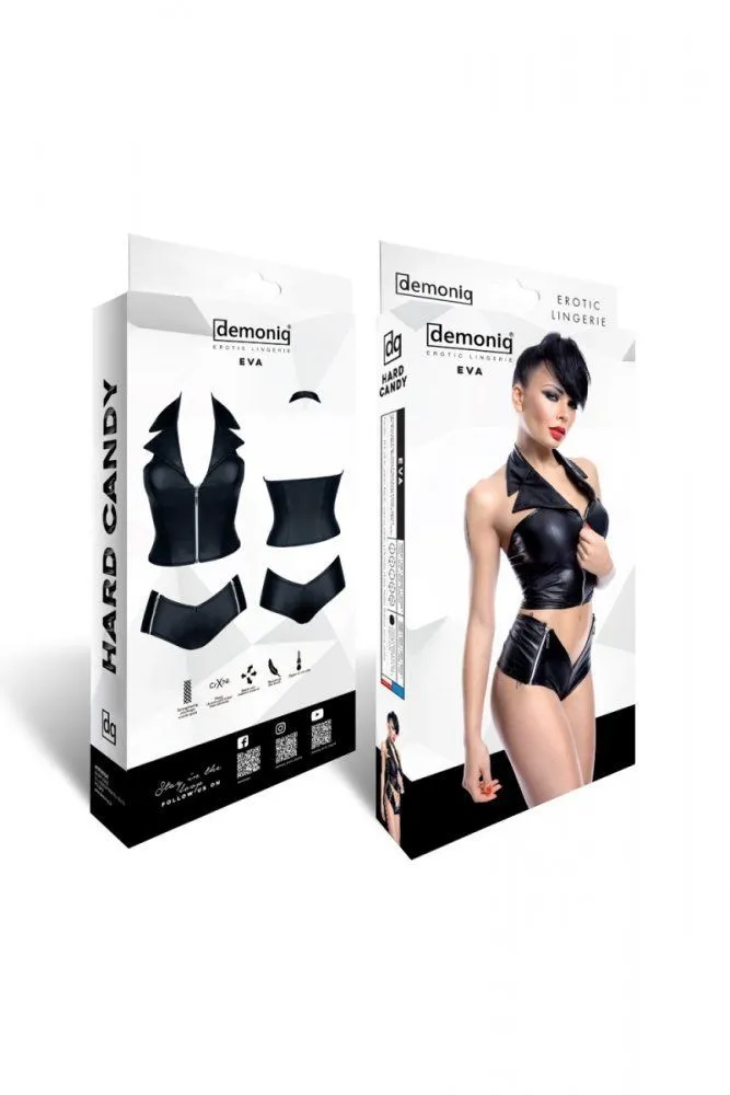 Подчёркнуто эротический и вызывающий комплект включает в себя чёрный жилет и шорты из глянцевой ткани под «кожу» с металлическими молниями. Комплект идеально подойдёт для властных женщин, желающих быть неотразимыми. Форма вашей груди будет подчёркнута за счёт восхитительного жилета из эластичной ткани с мокрым эффектом, а металлическая молния привлечёт к груди особое внимание. Чёрные шорты из такого же материала, как и жилет, прекрасно облегают форму ягодиц, а металлические молнии придают дополнительное очарование.