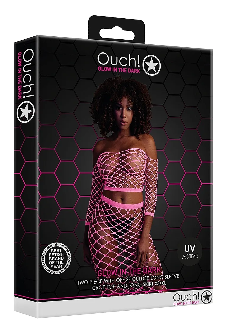 Яркий комплект из топа и юбки в сеточку. Эластичный материал мягко тянется за счёт большего количества эластана в составе, не создавая эффект перевязок. Откровенно и притягательно. Комплект будет красиво облегать, подчёркивать фигуру и загадочно светиться под неоновым светом в спальне или на танцполе.