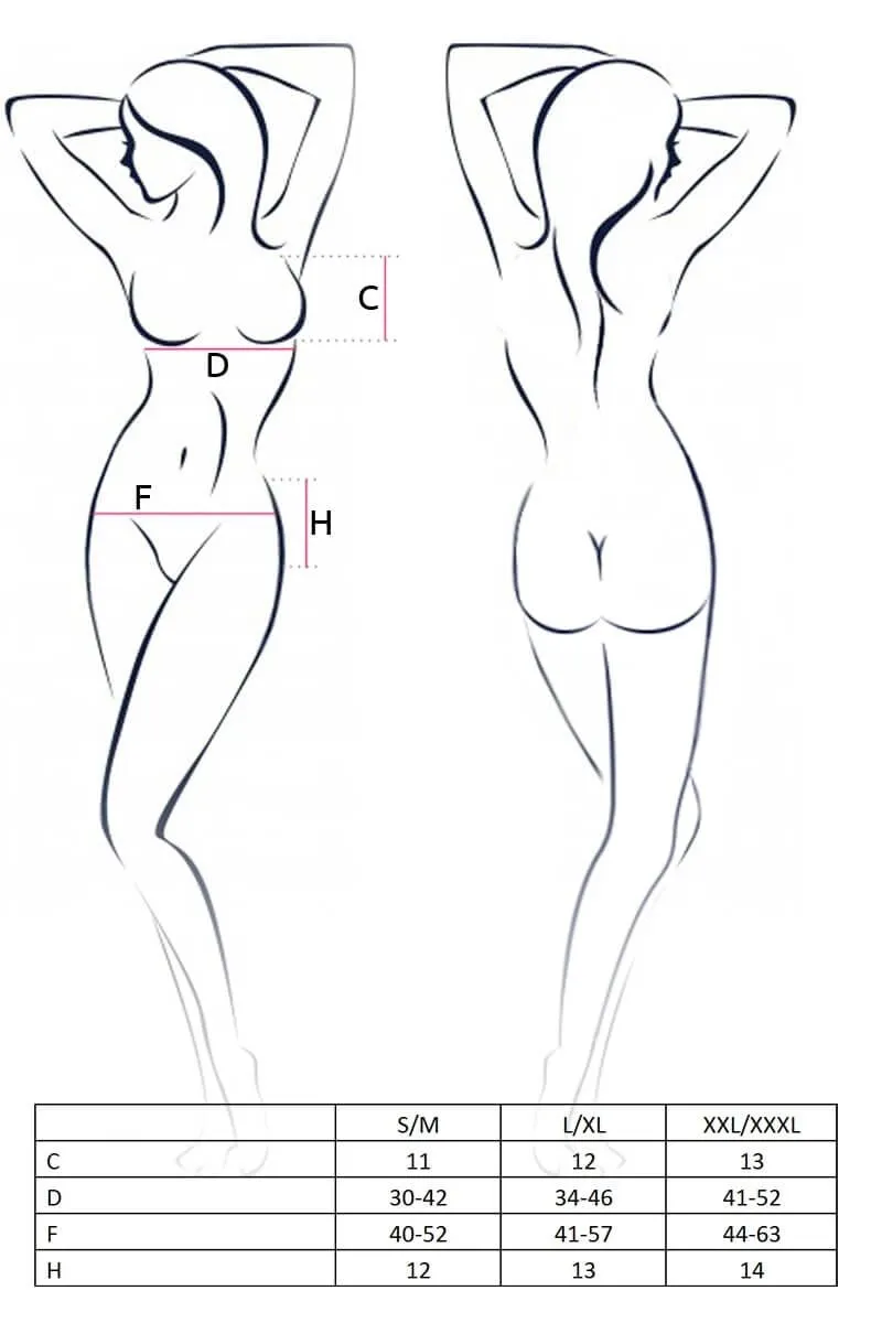 открытый бюстгальтер, контактные трусики-стринг и пояс с подвязками. Лямки бюстгальтера и подвязки регулируются по длине.