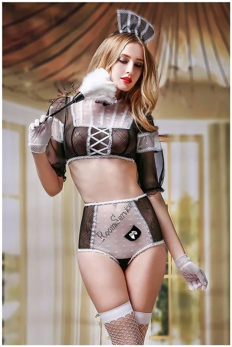 Прозрачный укороченный топ из эластичной кружевной сетки с имитацией шнуровки. Квадратная кокетка зрительно добавит объема груди. Свободные рукава подчеркнут тонкость рук. Такой топ идеально подойдет обладательницам небольшой груди и узкого плечевого пояса. Дополняют образ трусики с высокой талией, украшенные надписью «Room service» из страз. Продольные линии зрительно вытянут силуэт и визуально добавят длины ногам. Вид сзади эротично подчеркнет ложбинку ягодиц. Чулки из крупной сетки с эластичной резинкой и уплотненными носочком, сеточные перчатки, ободок и перьевая метелка сделают образ законченным.
