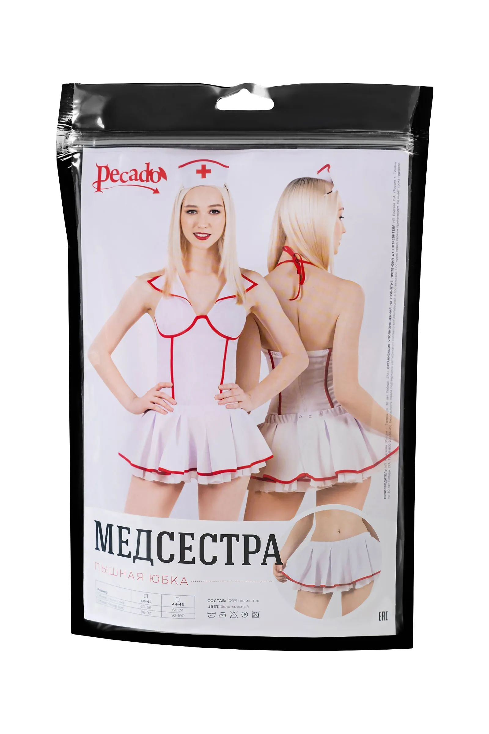 Нижняя и верхняя часть комплекта приобретаются отдельно. Именно так, Вы сможете подобрать оптимальный размер. Никто не откажется от тщательного осмотра обольстительной медсестры в сексуальном костюме от Pecado! Игривая юбка изготовлена из мягкой, прочной, тактильно приятной ткани. Легкие, воздушные складки дарят образу озорной шарм. Возбуждающая длина едва прикрывает самые аппетитные части бедер. А удобные застежки-кнопки на поясе помогают подобрать комфортную посадку на талии. Какой медсестрой Вы хотите быть? Озорной или послушной? Строгой или податливой? Решать только Вам. ● Состав комплекта – пышная юбка. ● Материал – 100% полиэстер. ● Качественная фурнитура. ● Цвет – белый с красным. ● Сделано в России. ● Размерный ряд 40-42, 44-46 (Соответствует Российской размерной сетке).