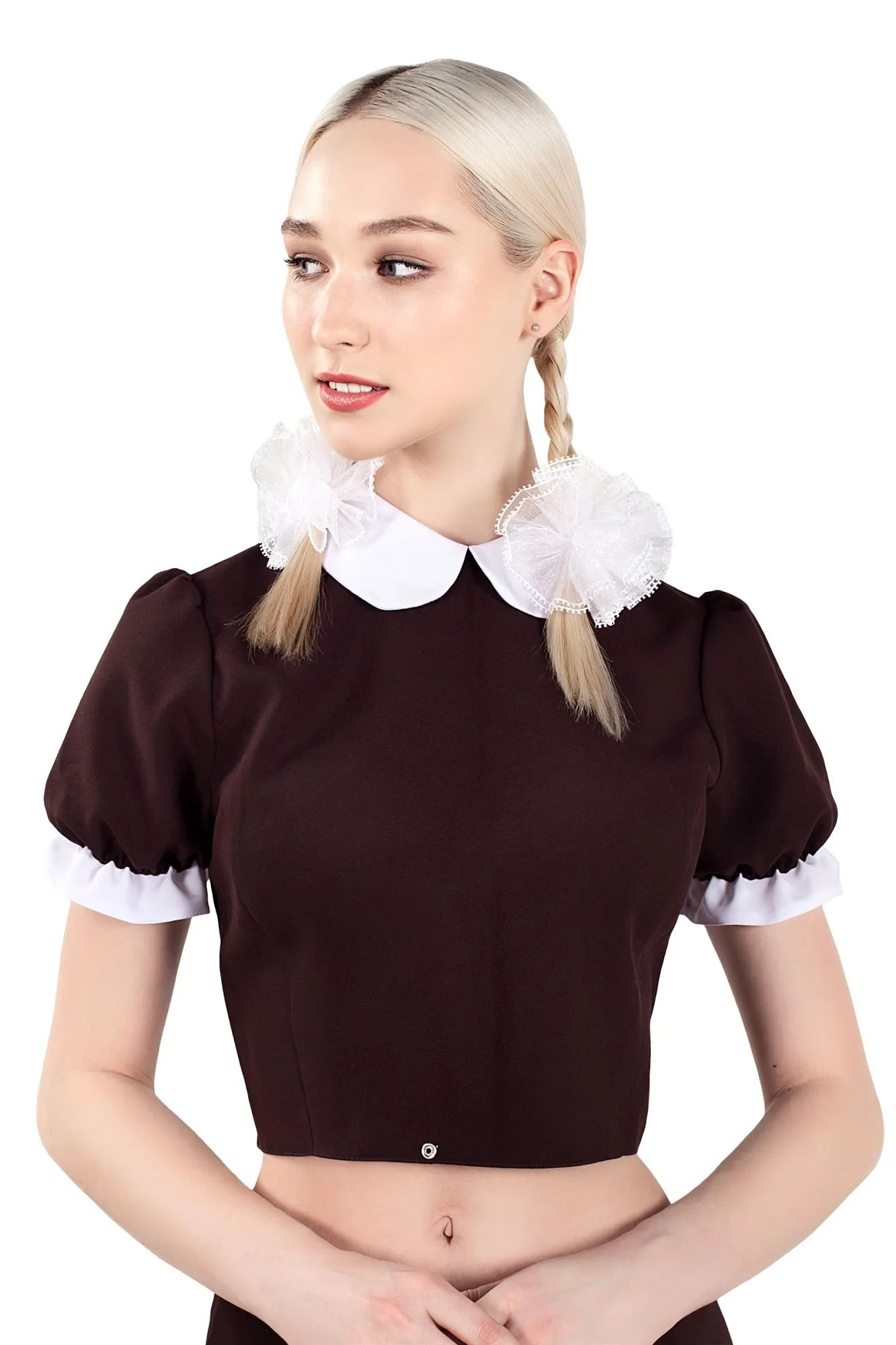 Эротический костюм русской школьницы от Pecado создан для Ваших самых чувственных ролевых игр! Темный топ, из которого выполнена верхняя часть комплекта, состоит из полиэстера. Материал нежный, приятный, износостойкий. Топ легко и быстро надевается, фиксируется с помощью застежек сзади. Также, благодаря металлической фурнитуре, соединяется с нижней часть костюма. Кокетливый вырез на спине открывает притягательный обзор и возбуждающий полёт фантазий. Быть школьницей, готовой к любым сексуальным урокам легко! Вместе с эротическим костюмом от Pecado. Нижняя и верхняя часть комплекта приобретаются отдельно. Именно так, Вы сможете подобрать оптимальный размер. ● Состав комплекта – топ, банты. ● Материал – 100% полиэстер. ● Качественная фурнитура. ● Цвет топа - коричневый, цвет бантов - белый . ● Сделано в России. ● Размерный ряд 40, 42, 44, 46 (Соответствует Российской размерной сетке).