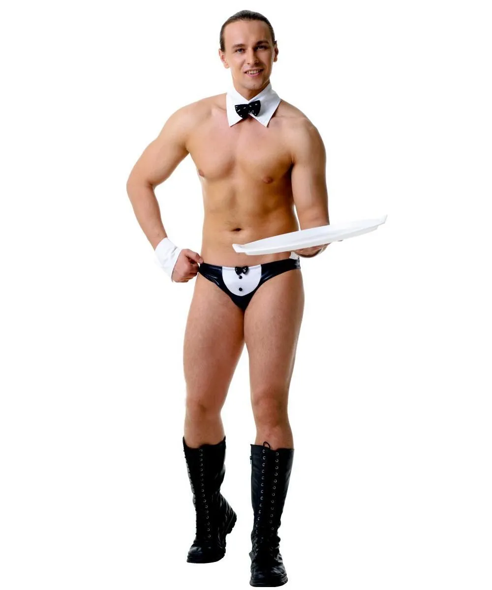 Мужской ролевой костюм официанта от компании Le Frivole подойдет для оригинальных и смелых мужчин, желающих приятно удивить свою избранницу! Преобразившись в страстного официанта, Вы сможете исполнить любую прихоть своей возлюбленной. Такой костюм включает в себя накладной воротник с бабочкой, манжеты и трусы, украшенные бабочкой. Наряд станет прекрасным вариантом для откровенной костюмированной вечеринки или интимных игр с партнершей.