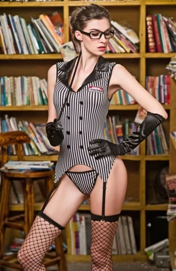 Обтягивающий корсет в черно-белую полоску, украшенный декоративными пуговками и рюшами из кружев, визуально сделает фигуру более стройной и подчеркнет ее достоинства. Дополнят костюм трусики такой же расцветки, перчатки до локтя и чулки в крупную сетку. Возьмите в руки указку и наденьте очки, чтобы образ стал более убедительным.