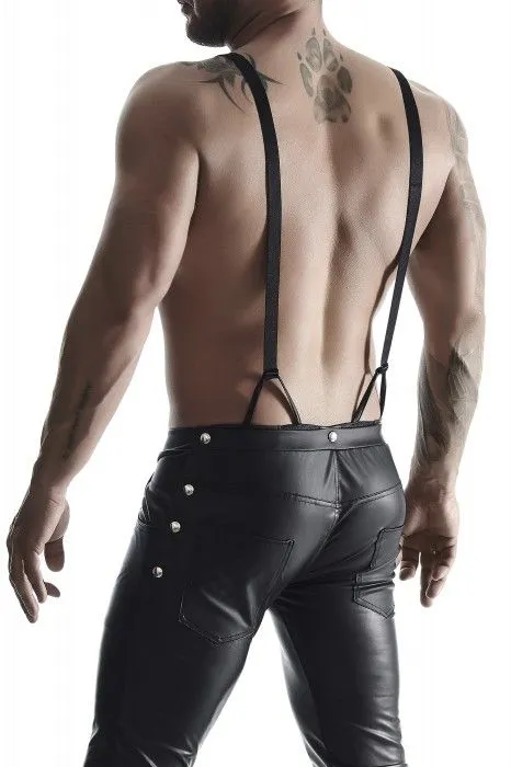 Мужские брюки с подтяжками в баварском стиле длиной ¾. Выполнены из эластичной и приятной на ощупь экокожи. Отстёгивающиеся подтяжки из прочной блестящей широкой резинки. Сзади имеется потайной доступ к ягодицам – достаточно просто отстегнуть заднюю часть брюк и у вас появляется возможность почувствовать нежные прикосновения партнёрши. В отделке присутствуют металлические серебристые элементы. Все швы с укрепляющей строчкой.