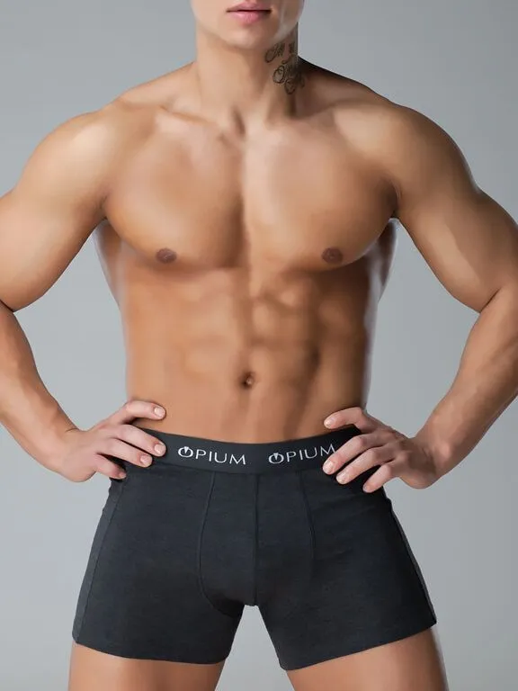 Популярная классическая модель удлиненных боксеров из меланжевой ткани. Комфортная резинка с логотипом Opium. Выполнены в цвете «мокрый асфальт».