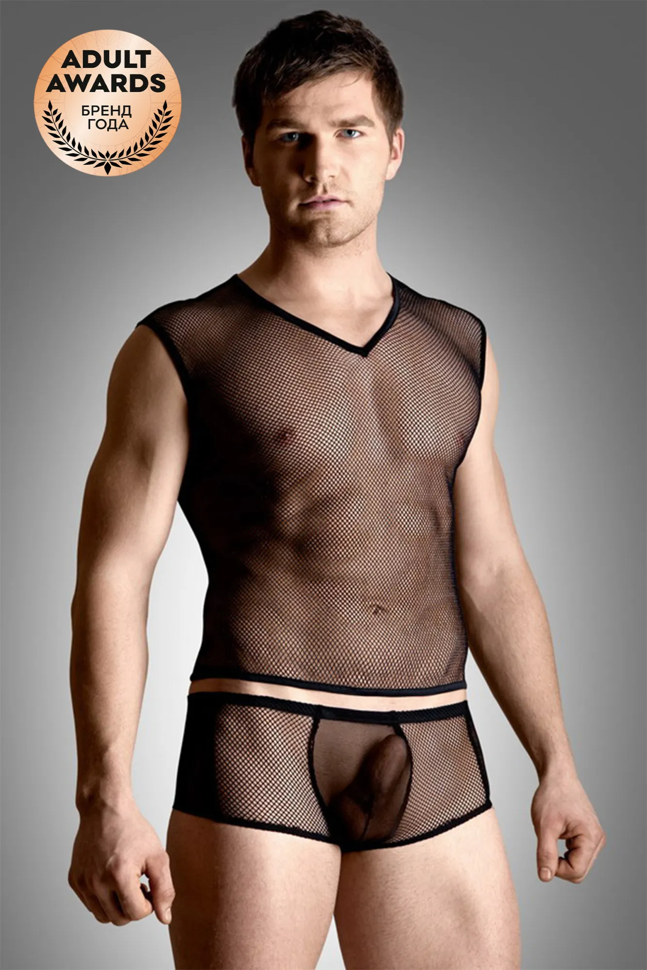Экстравагантный комплект для смелых мужчин. Футболка и шорты выполнены из крупной эластичной сетки. Задняя часть трусов выполнена из мягкой мелкой сеточки, спереди вставка из такой же сеточки.