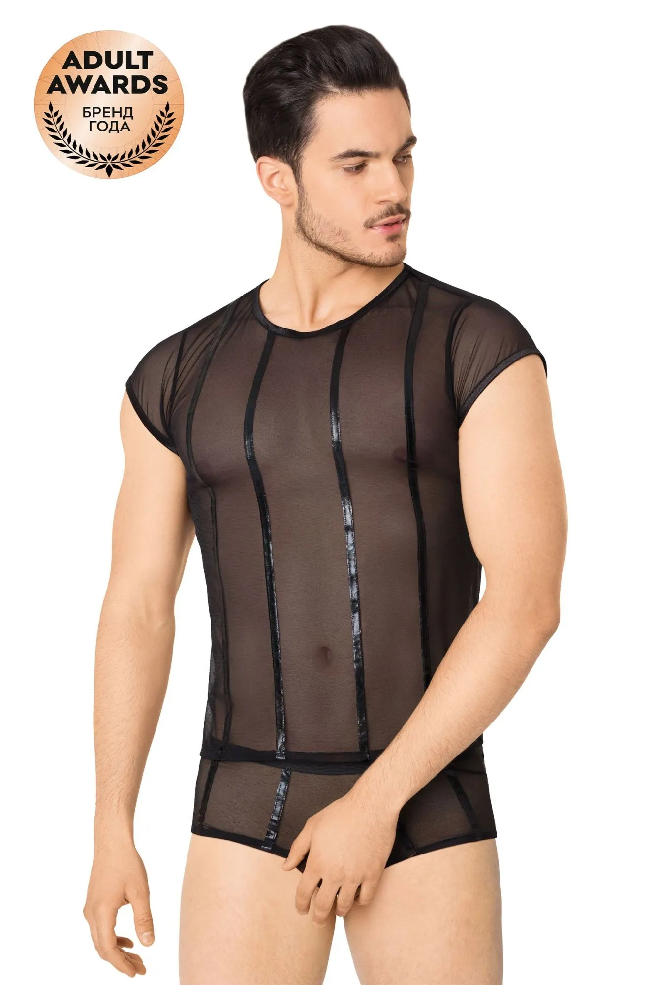 Экстравагантный комплект для смелых мужчин. Футболка и шорты выполнены из крупной эластичной сетки. Задняя часть трусов выполнена из мягкой мелкой сеточки, спереди вставка из такой же сеточки.