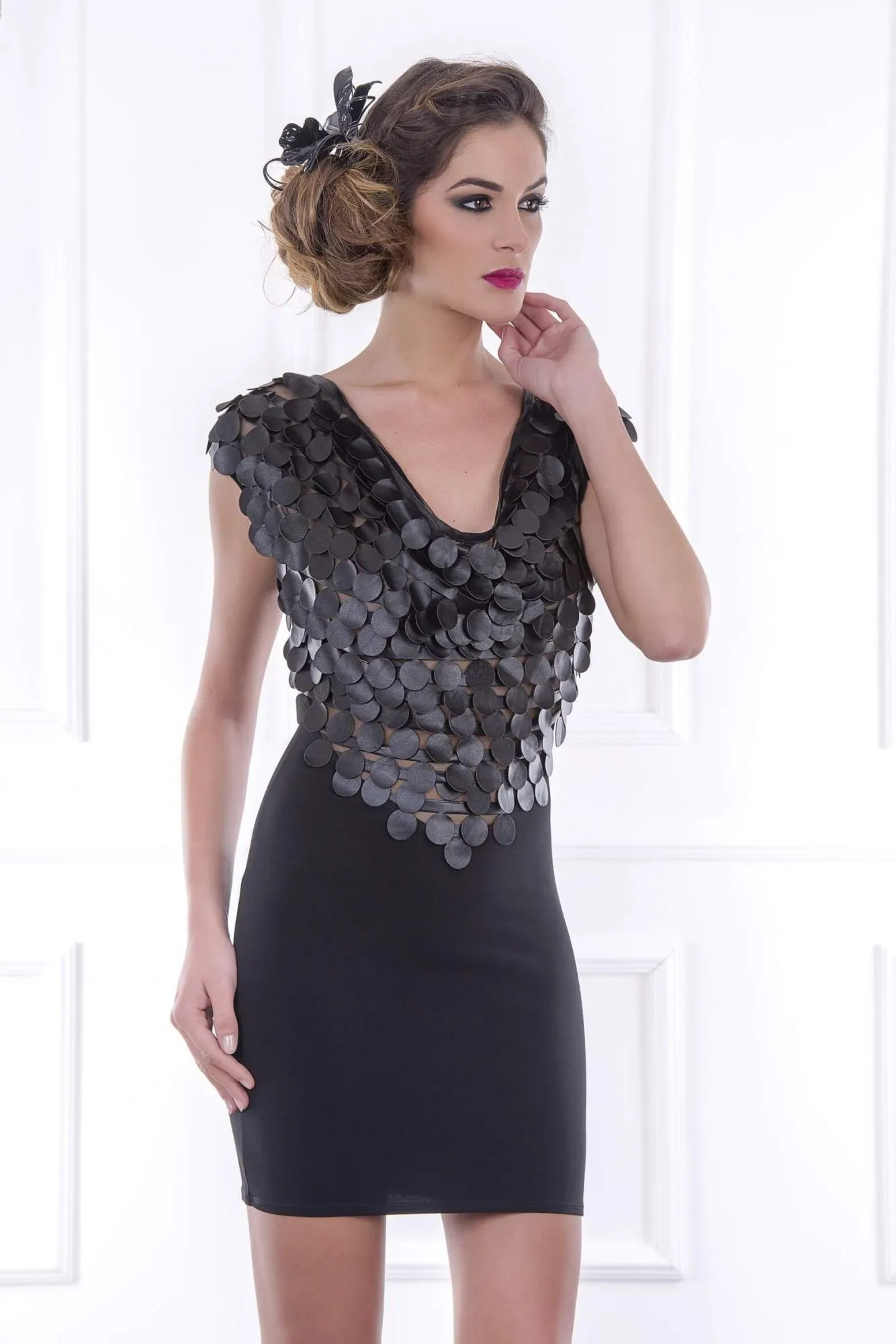 Короткое черное платье Osisko из коллекции Tome 13 от французского модельера Patrice Catanzaro придаст Вашему образу соблазнительности и чувственности. Оно изготовлено из эластичного материала, благодаря которому будет идеально облегать Вашу фигуру, выделяя все ее достоинства. Платье богато украшено мягкими пайетками "под кожу", сквозь которые можно мимолетом увидеть очертания груди. А крупный вырез сзади обнажит спину, делая Ваш облик еще более манящим и соблазнительным.