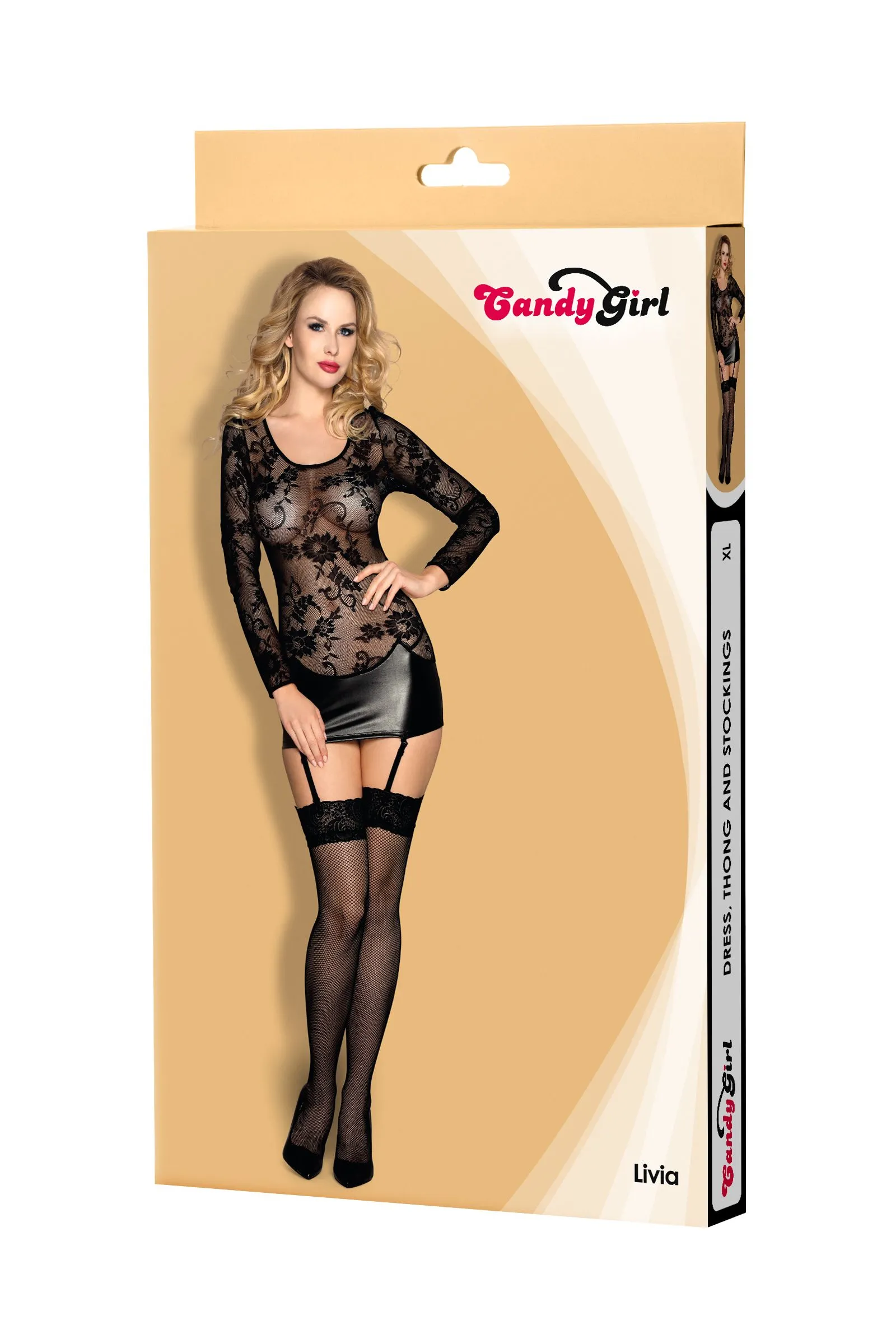 Эффектное эластичное платье Candy Girl® Livia с длинными рукавами представит фигуру в выгодном свете, зрительно удлинив ее и подчеркнув стройность. Юбка wetlook экстремально короткой длины привлечет внимание к бедрам и ягодицам. Съемные регулируемые пажи в паре с чулками обеспечат идеальное прилегание и натяжение. Образ дополняют чулки в сетку с широкой кружевной резинкой без силикона, с усиленным мыском, и Т-стринги с ластовицей.