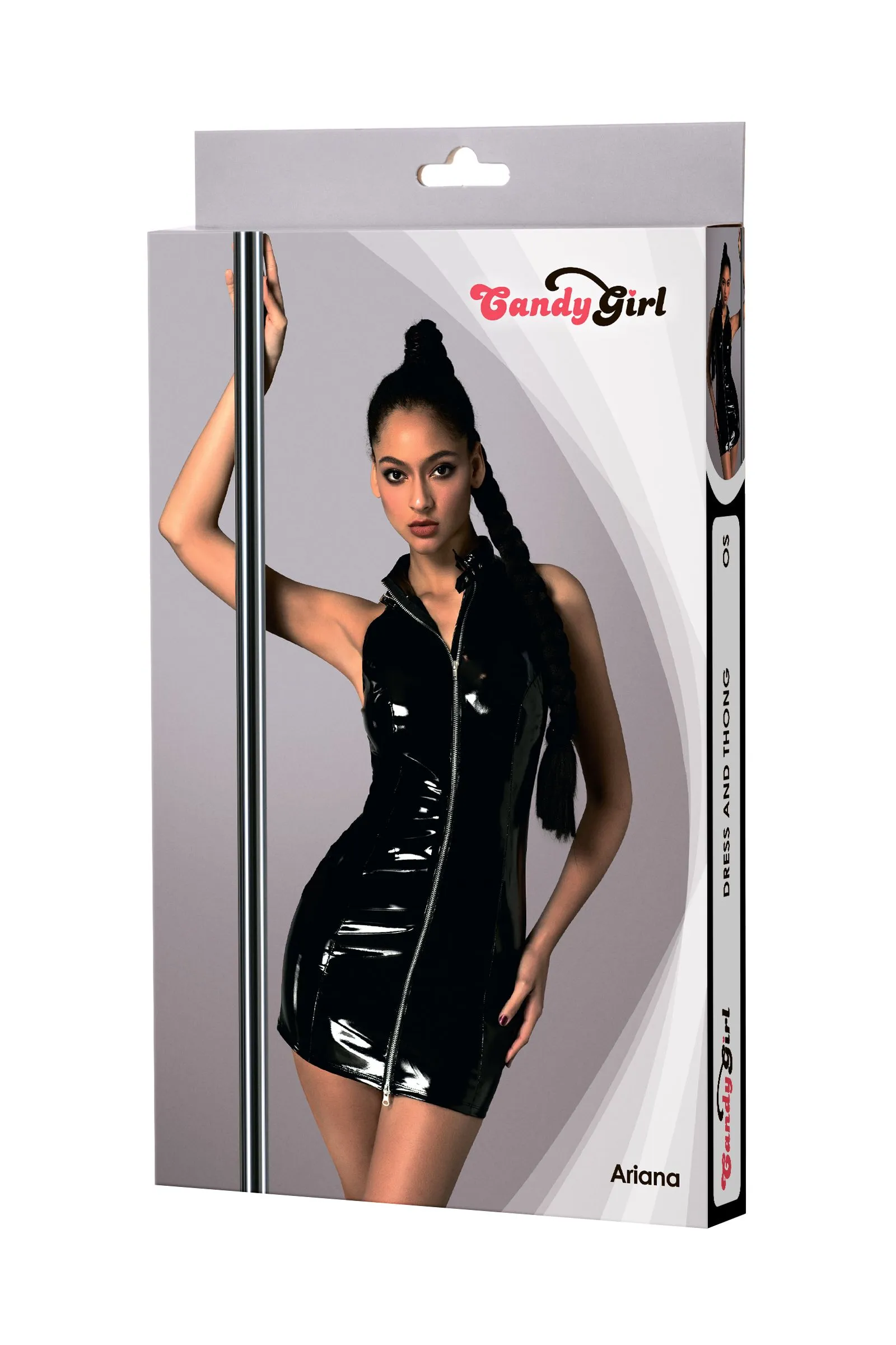 Облегающее лаковое платье Ariana от Candy Girl® с воротником-стойкой привлекает внимание к каждому движению даже в полумраке. Двухсторонняя металлическая молния не только зрительно вытягивает силуэт, но и позволяет избавиться от платья в считанные мгновения. Подходящие стринги идеально дополняют комплект.