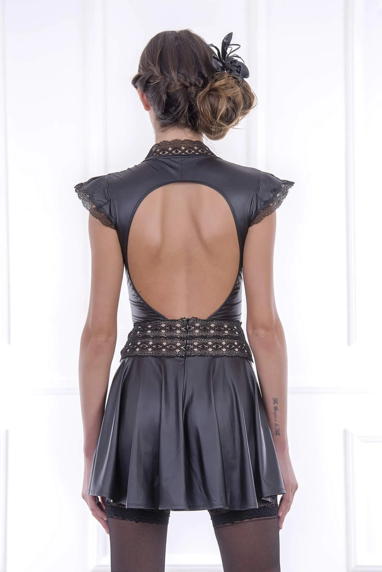 Платье Fassett из коллекции Tome 13 от французского дизайнера Patrice Catanzaro изготовлено из материала, имитирующего мокрую кожу. Оно имеет глубокое декольте, маленькие рукава-крылышки, расклешенную юбку и кружевной пояс, подчеркивающий талию.