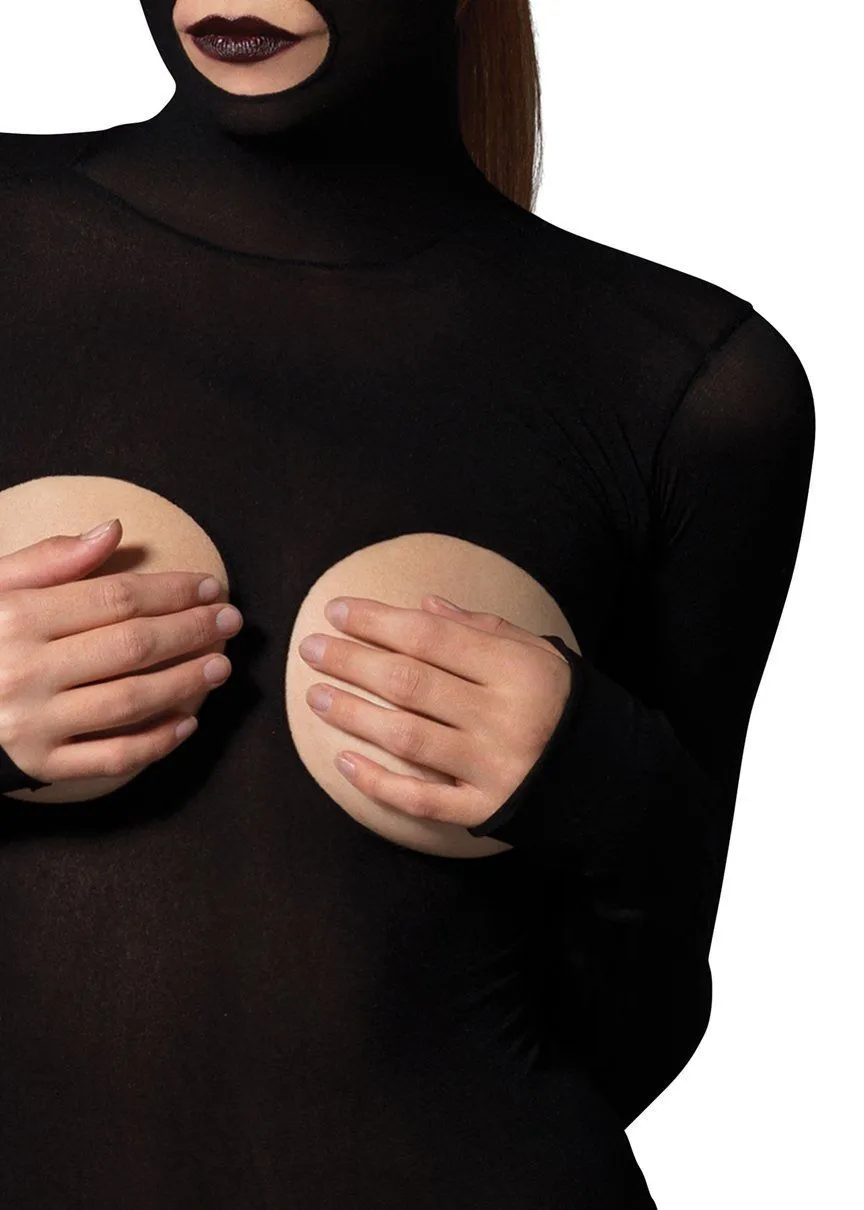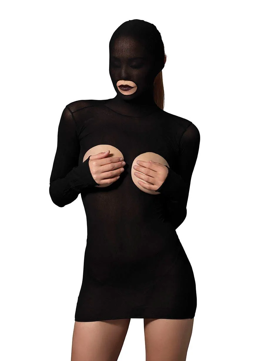 Оригинальное платье в стиле БДСМ выполнено из черного непрозрачного материала и имеет несколько вырезов. Платье почти полностью закрывает лицо, открытым остается только рот. На затылке есть вырез, позволяющий не скрывать волосы. Грудь и ягодицы будут открыты - подобный провокационный наряд, несомненно, разожжет страсть в Вашем мужчине!