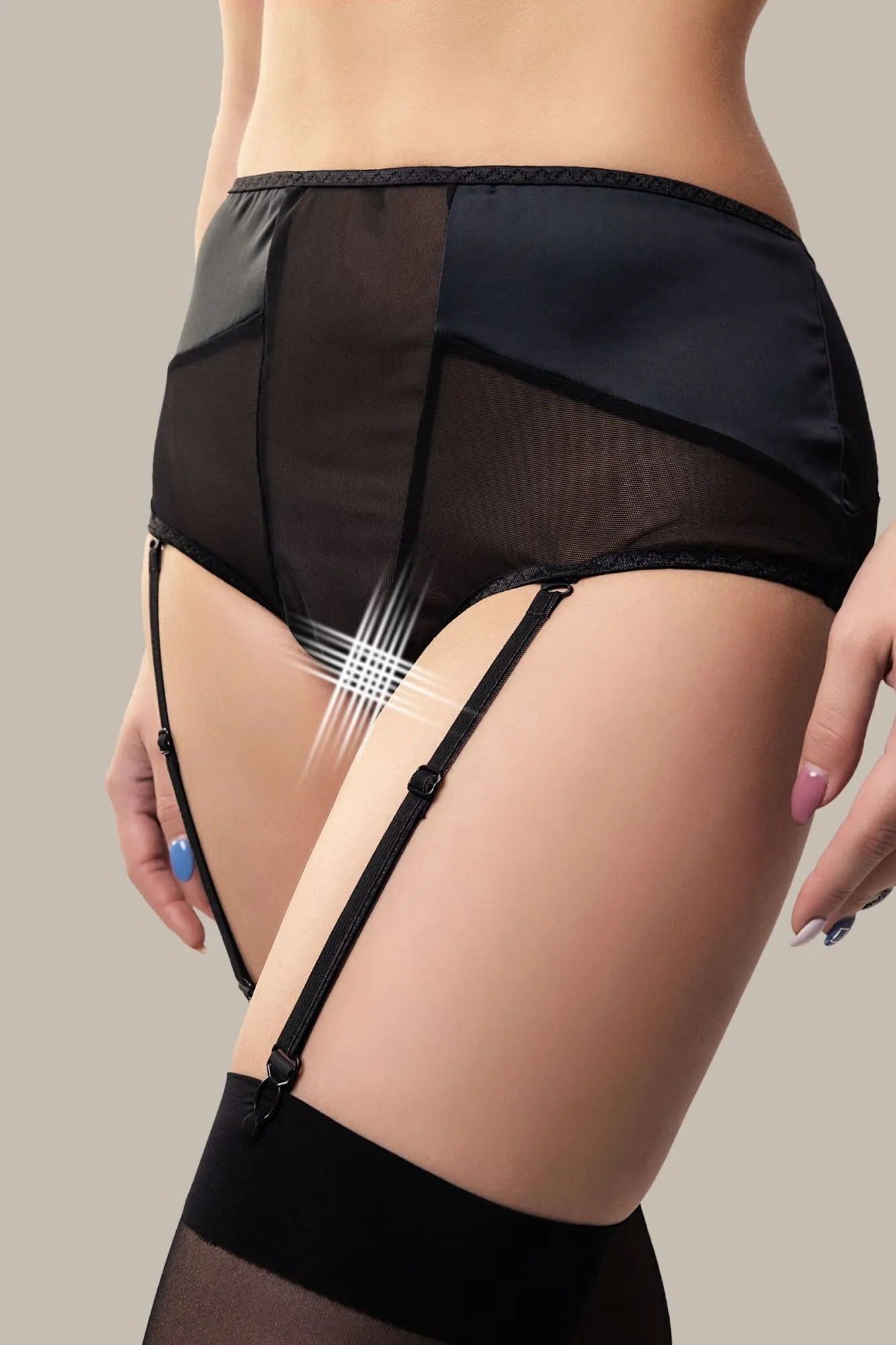 Линия провокационного эротического белья WANAME® Apparel – для женщин, которые хотят наслаждения и не скрывают этого. Эротические трусики-пояс для чулок «Э́лэгэнс» (англ. Elegance – «Элегантность») из тонкой прозрачной эластичной сетки и стрейч-сатина облегают бедра, ощущаются невесомыми, не сковывают движений, но визуально меняют силуэт. Шелковистая поверхность материала дарит приятные ощущения при прикосновении. Современные элементы дизайна тешат женское самолюбие. Трусики с высокой талией зрительно удлиняют ноги, подчеркивают сексуальный переход от талии к бедрам. Непрозрачные вставки скрадывают объем в области бедер. Швы, вытачки и регулировка по талии создают силуэтную посадку. Съемные регулируемые пажи, открытая зона копчика и эротический доступ подчеркивают чувственный образ. Модели белья Waname® Apparel эксклюзивны, разработаны и произведены в России с учетом предпочтений российских покупательниц. *Чулки в комплект не входят. На фото и видео трусики-пояс Waname® Elegance дополнены браллетом Waname® Delicacy.