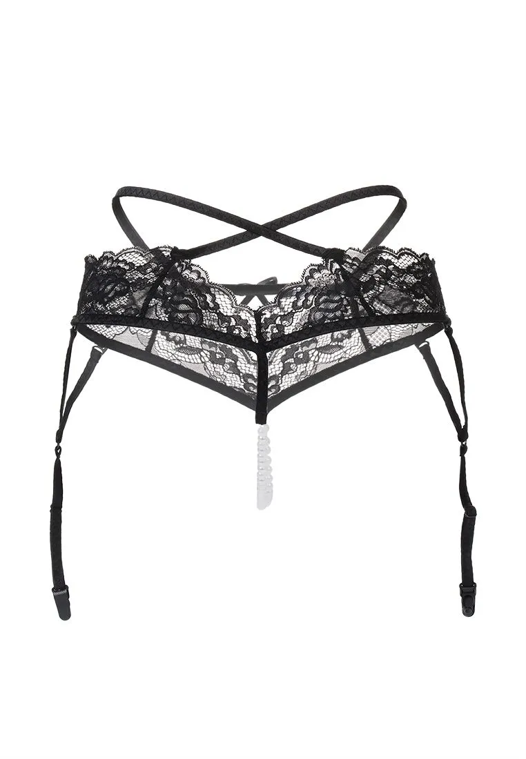 Эротические трусики-пояс с жемчужной нитью Erolanta Wendy кружевные, черный 50-52